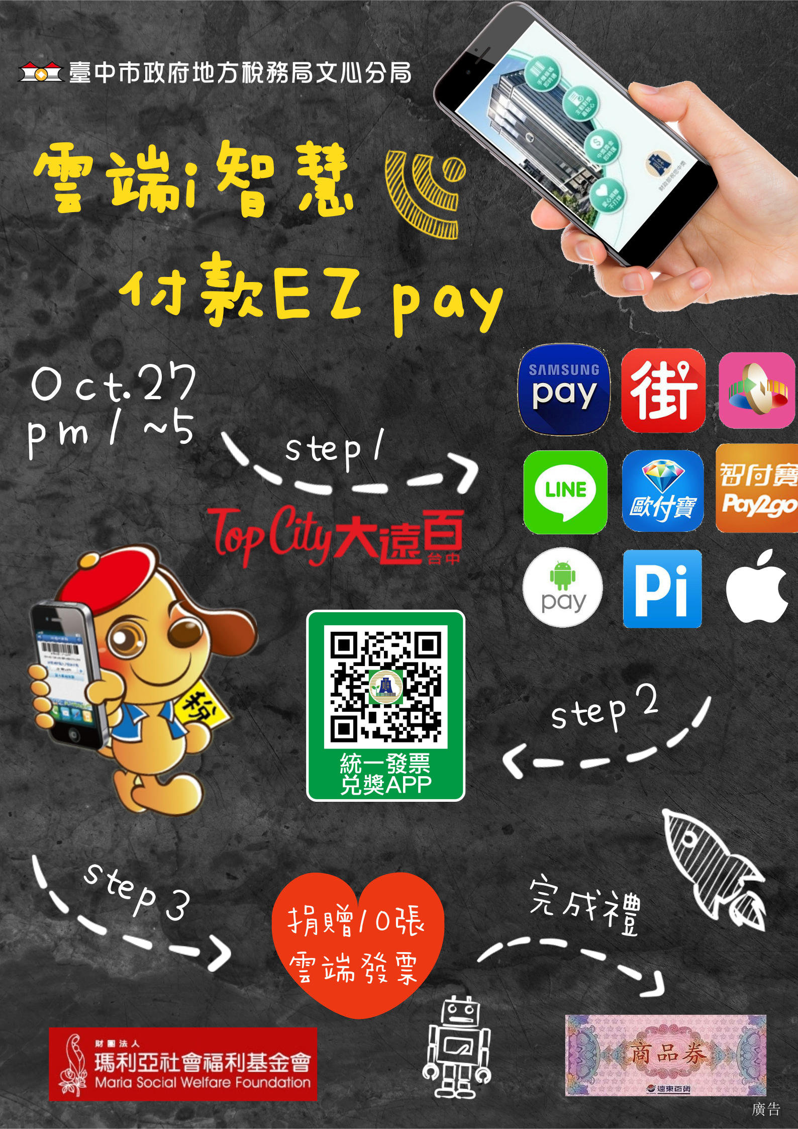 台中市政府地方稅務局文心分局將於10月27日下午1時至5時,在台中大遠百Top City12樓廣場舉辦「雲端i智慧 付款輕鬆pay」租稅宣導,當日以行動支付將發票存載具,捐贈10張未開獎雲端發票並下載財政部「統一發票兌獎APP」,即可兌換遠東百貨100元商品禮券1張,歡迎踴躍參加。