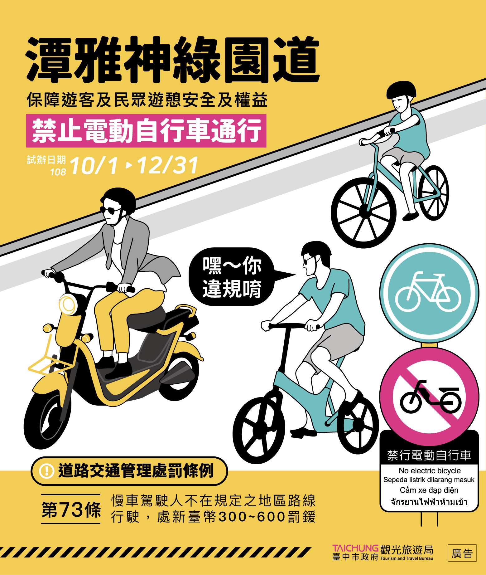 觀光旅遊局長林筱淇表示,潭雅神綠園道為自行車專用道,只能騎自行車,除了禁止電動自行車通行,該區也已公告禁止汽、機車通行,若違規行駛者也將受罰,以共同維護遊憩民眾安全舒適的自行車道旅遊環境。