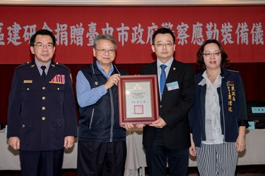 中華民國工商建設研究會中區聯誼會經由會員捐款募得178萬元,採購包括拋射式電擊器、防暴網、破窗尾蓋、微型攝影機等員警應勤設備捐贈台中市政府警察局,並捐贈潭子區聚興里守望相助隊1輛社區巡邏車。副市長令狐榮達今(1)日代表市府受贈及回送感謝狀予中區聯誼會會長吳生泉,期盼有更多力量支持警察工作,共同守護台中治安。