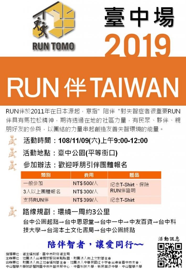 台中市政府衛生局與向上文教基金會將在11月9日上午9點於北區台中公園舉辦「Run伴Taiwan 2019-台中場」伴走嘉年華,當天有健走倡議、失智症篩檢及衛教、老化體驗等活動,期望透過活動倡導失智症議題的重要性,歡迎民眾踴躍參加!