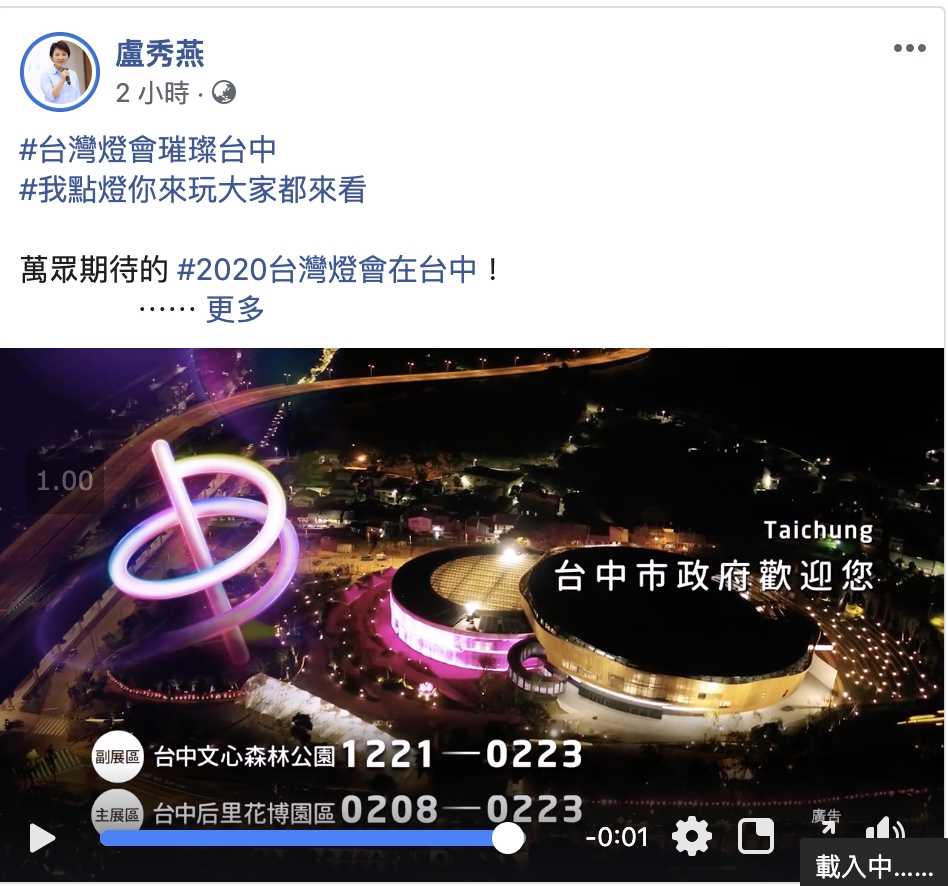 台中市長盧秀燕個人LINE、臉書、市府官方LINE及各粉專,昨晚8時同步發布台灣燈會前導影片,12小時播放超過2萬次。這支短短31秒的影片,道盡台中日常,白天擁有旺盛曙光,夜晚則幻化為森林秘境,從著名的彩虹眷村、路思義教堂出發,行經高美濕地黃昏美景,看見秋紅谷、國家歌劇院的都市夜景,最後來到台灣燈會副展區文心森林公園及主展區后里花博園區,歡迎遊客揪團感受燈會之美。