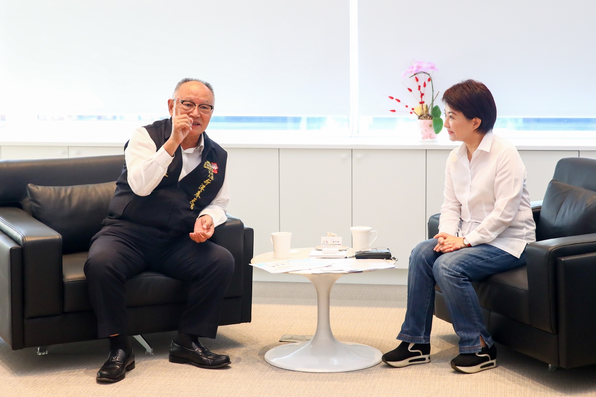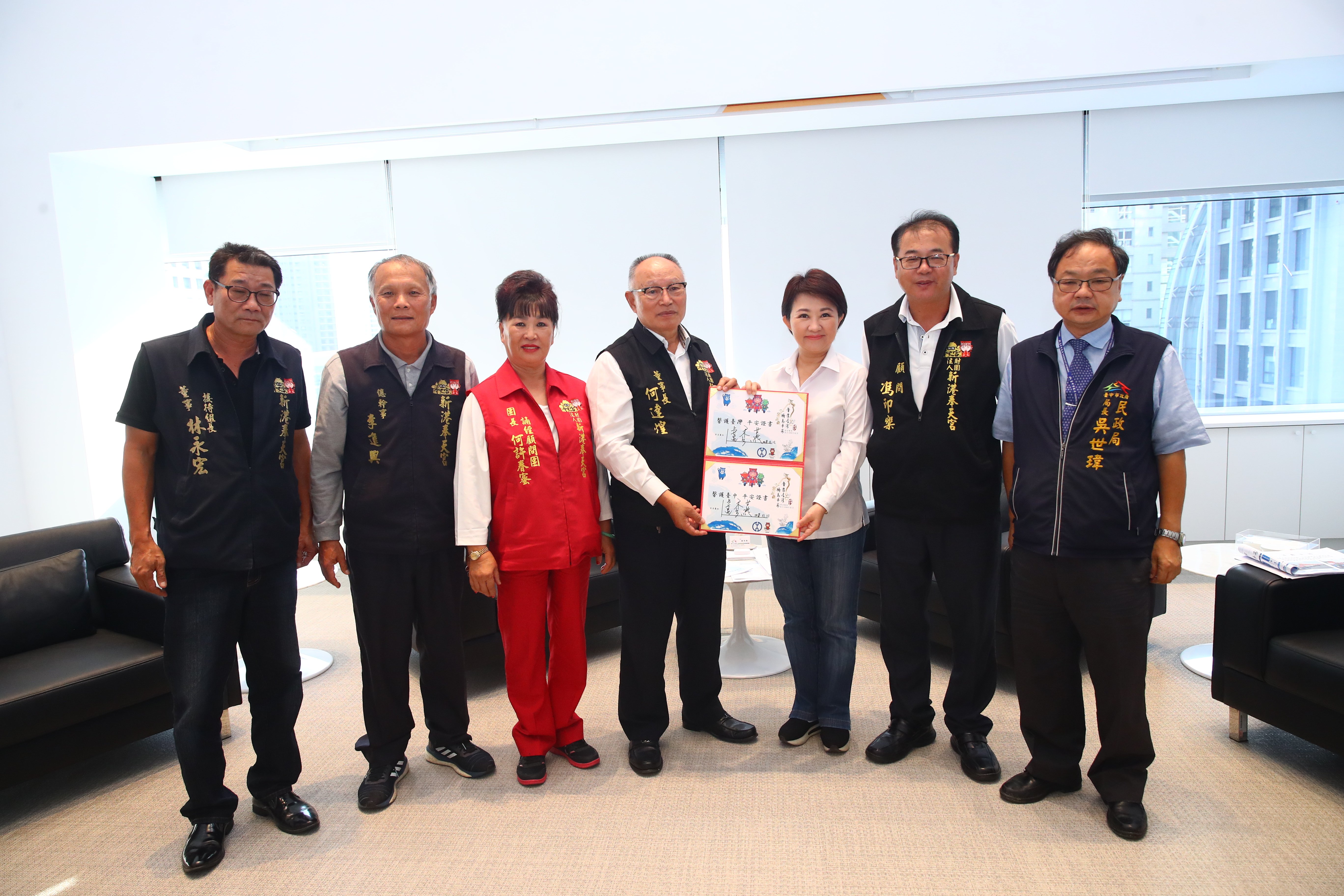 盧市長在民政局長吳世瑋的陪同下,與新港奉天宮董事長何達煌等一行人交流。盧市長表示,嘉義縣新港奉天宮與台中市關係良好,每年大甲鎮瀾宮遶境,均會至新港奉天宮駐駕並舉行祝壽大典,今年活動由副市長陳子敬代表前往現場致意。