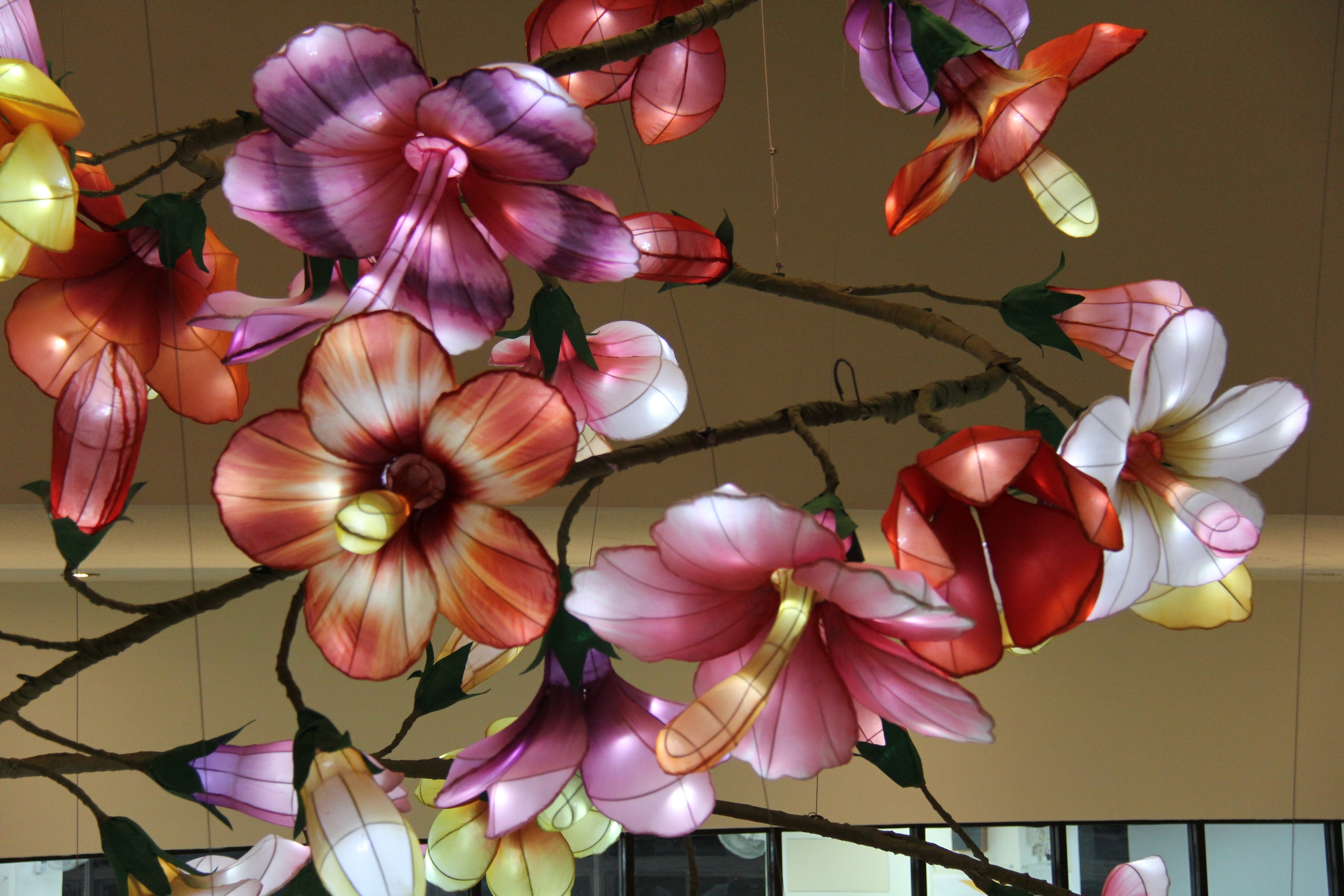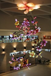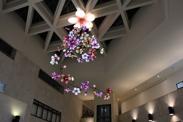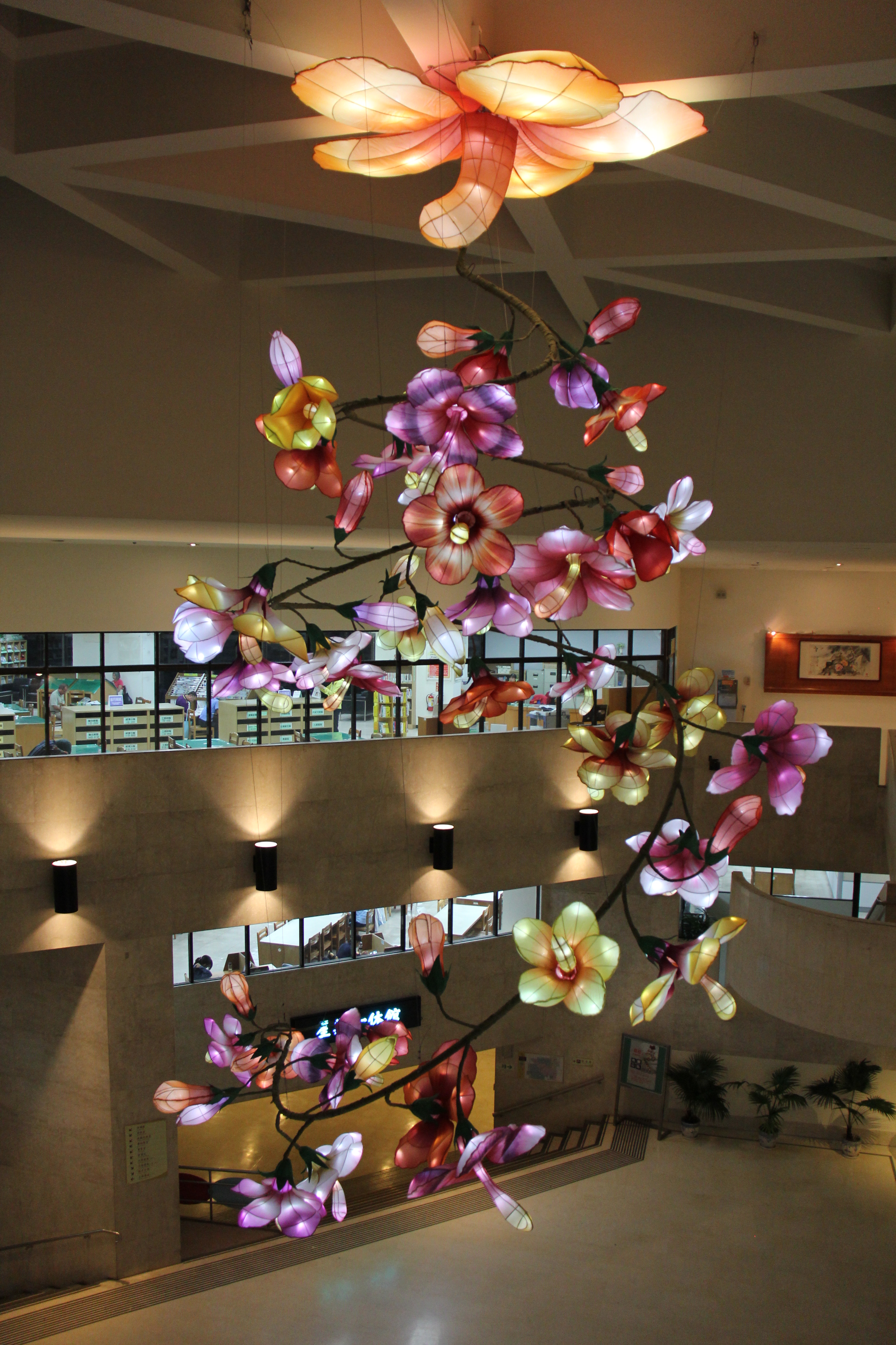 市府文化局表示,大墩文化中心館內大廳光彩奪目、由天然染大師陳景林操刀的「槿綻」,以50朵大小不一、各種色彩的花朵螺旋懸吊於大廳,採光玻璃帷幕下高達七米的裝置藝術。