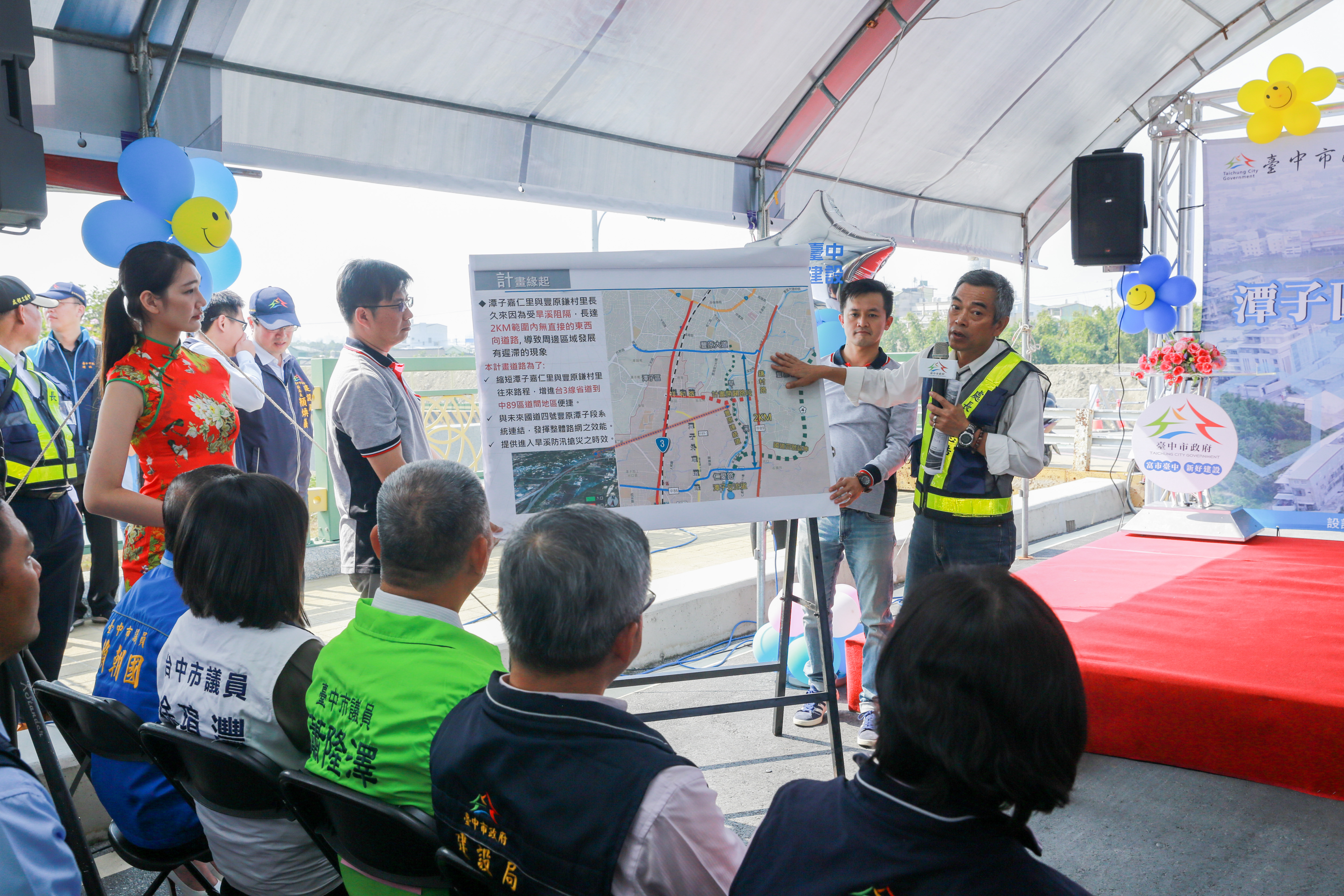 今日通車啟用典禮,由楊副市長主持,市府顧問李允傑、內政部政務次長花敬群、市府建設局長陳大田、立委江啟臣、議員賴朝國、蕭隆澤、徐瑄灃及當地多位里鄰長皆到場觀禮,場面熱鬧。