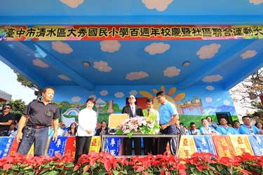 台中巿清水區大秀國小今年創校100週年,學校從4月1日創校日當天起,陸續舉辦多項活動慶祝,市長盧秀燕今(16)日前往校慶祝賀時表示,「祝福生日快樂、校運昌榮!」適逢學校百歲生日,市府加強補助經費近300萬元,協助校園設備更新、設置樂活運動站等,提供師生更完善的校園環境。