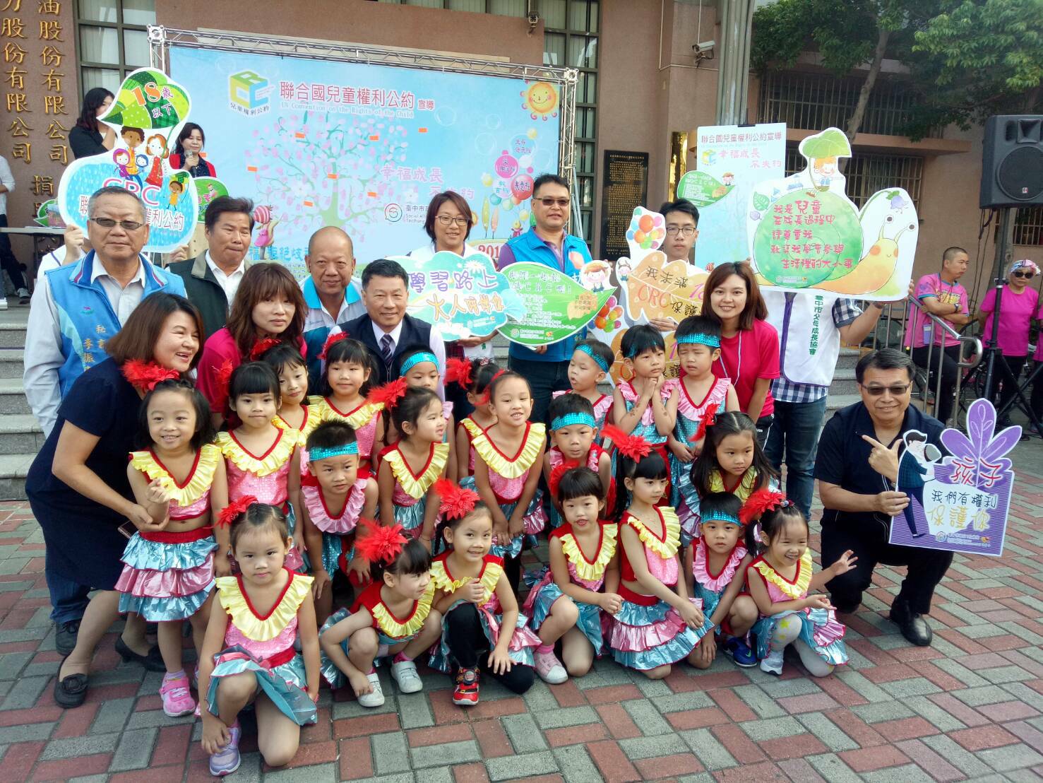 今日活動包括綠柳町薩克斯風樂團、台中市幸福心志工協會、台中市中區國際熱愛大自然促進會及台中市立大肚幼兒園等15個協辦單位也到場,一起推廣兒童權利公約。