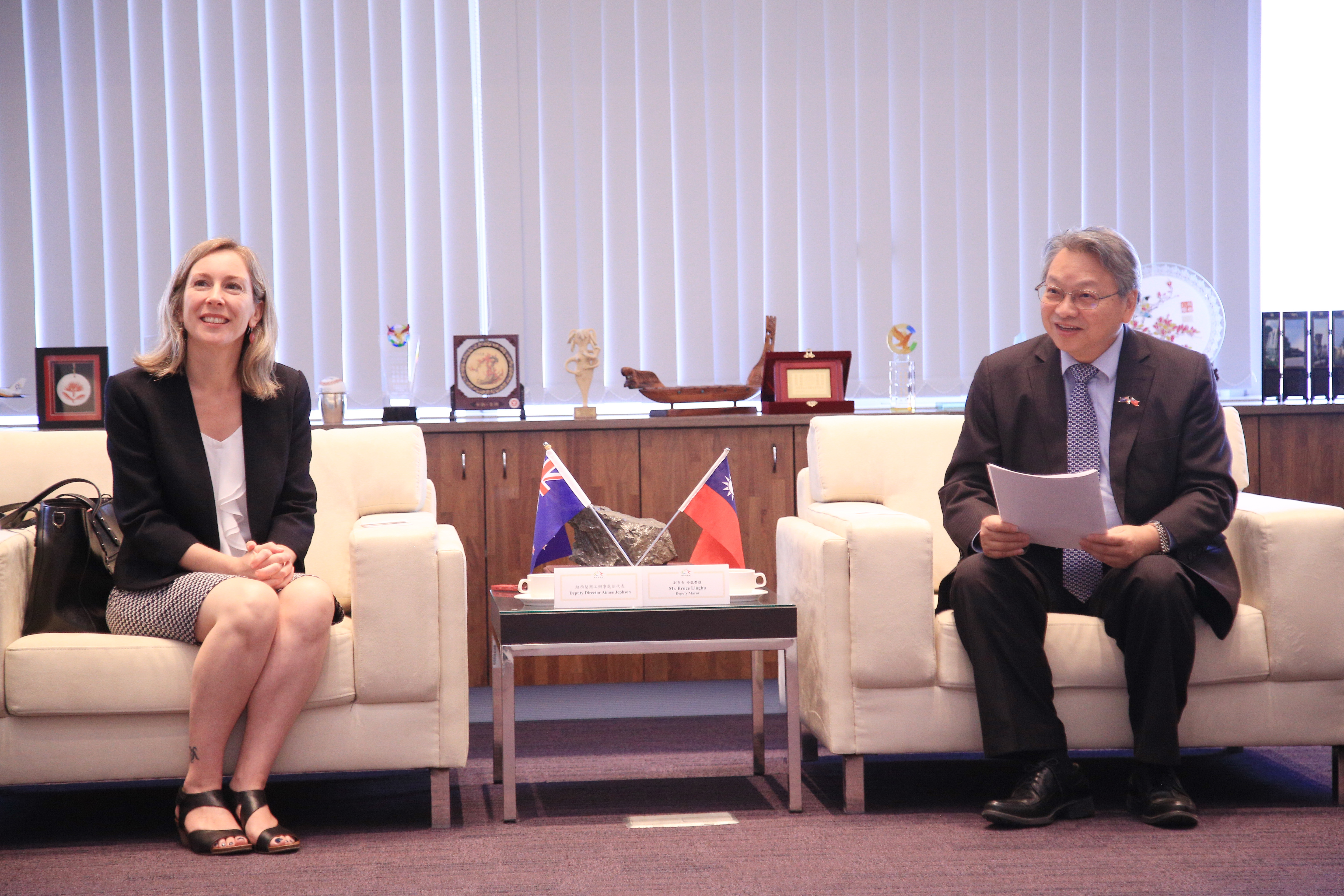 今日紐西蘭商工辦事處副處長Aimee Jephson及其助理一行人拜會市府,除令狐副市長外,原民會主委林益陸、消防局副局長戴峻焜、經發局代表、新聞局代表及秘書處人員等人也到場共同接待,現場會談氣氛熱烈融洽。
