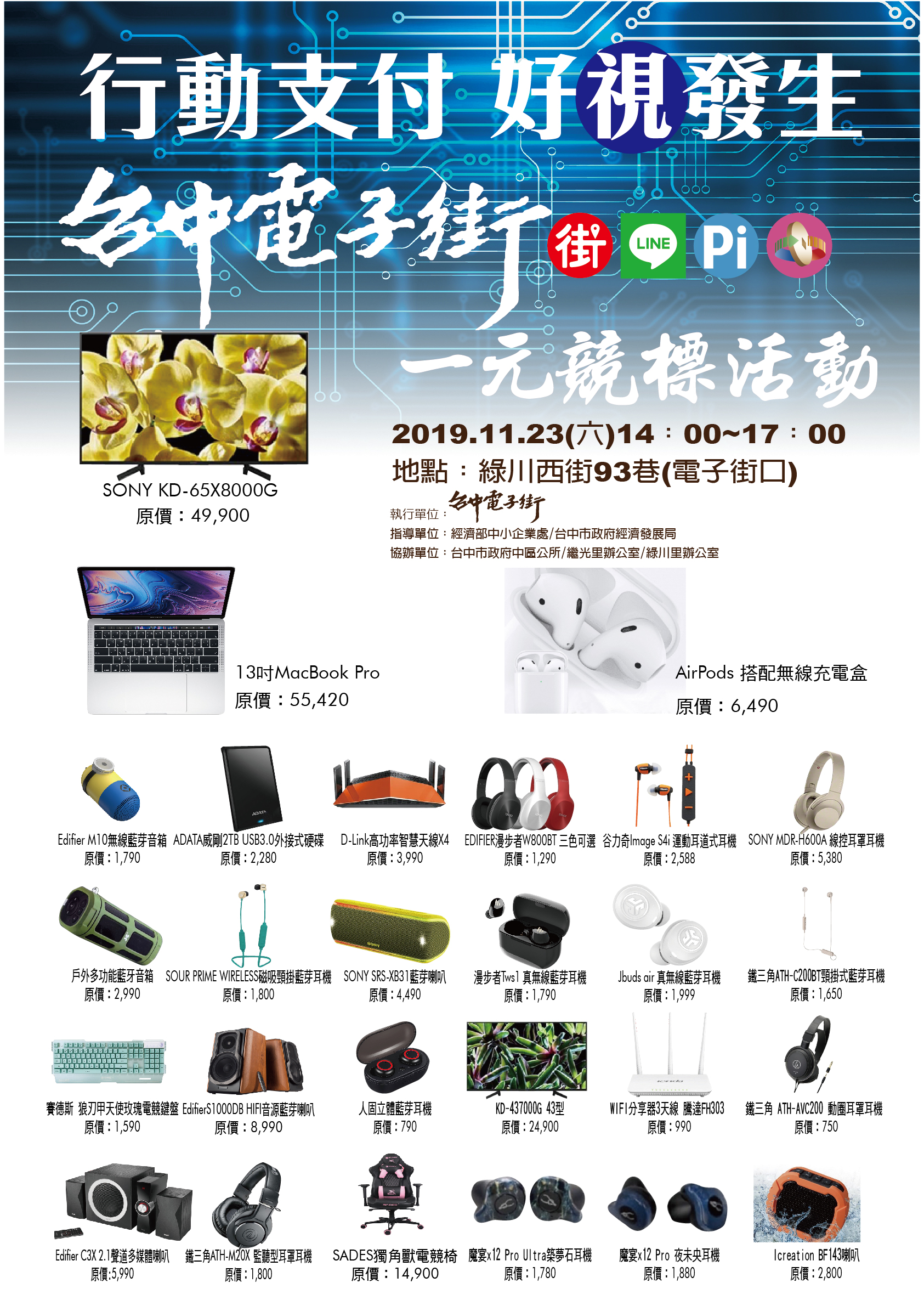 市府經濟發展局表示,電子街商圈鄰近台中火車站,不僅交通便利,更是全國首個以「資訊產品」為主題的商業街道。電子街商圈主委楊菘渾指出,這次1元競標活動為鼓勵民眾及店家使用行動支付,邀請商圈業者提供多項超值3C商品,現場也將有行動支付業者駐點辦理相關業務,民眾不用帶錢包出門,只要下載街口支付、台灣Pay、Line Pay一卡通、Pi 錢包,「滑滑手機」就可以輕鬆帶回超值3C商品。