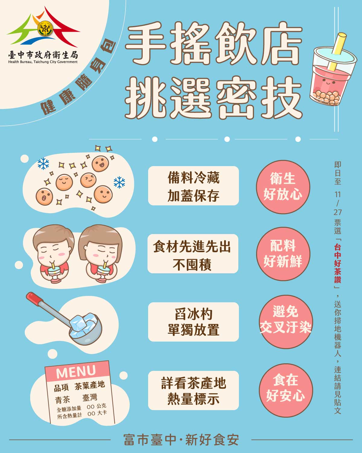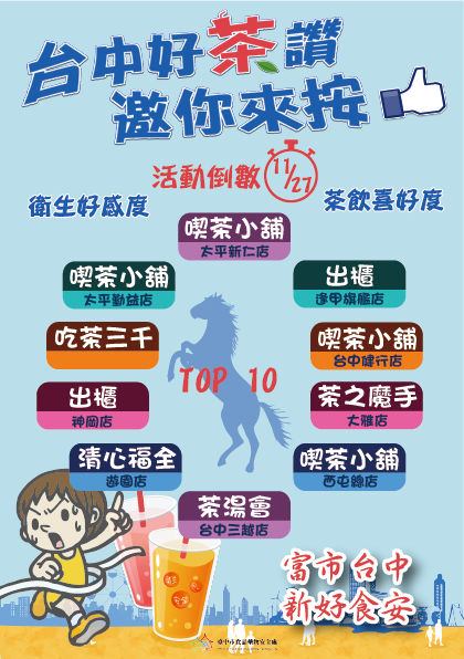 由台中市食品藥物安全處舉辦的「台中好茶讚」票選活動大受歡迎!截至11月24日止,總投票數高達118,503票,參加者包含春水堂、50嵐、茶湯會、老虎堂、大苑子、台灣第一味等知名店家,其中「茶之魔手」、「出櫃」、「清心福全」3家品牌急起直追,闖入前10大排名榜內,競爭激烈。活動至11月27日截止,還有3天,歡迎民眾把握時間上網投票,選出最喜愛的店家。