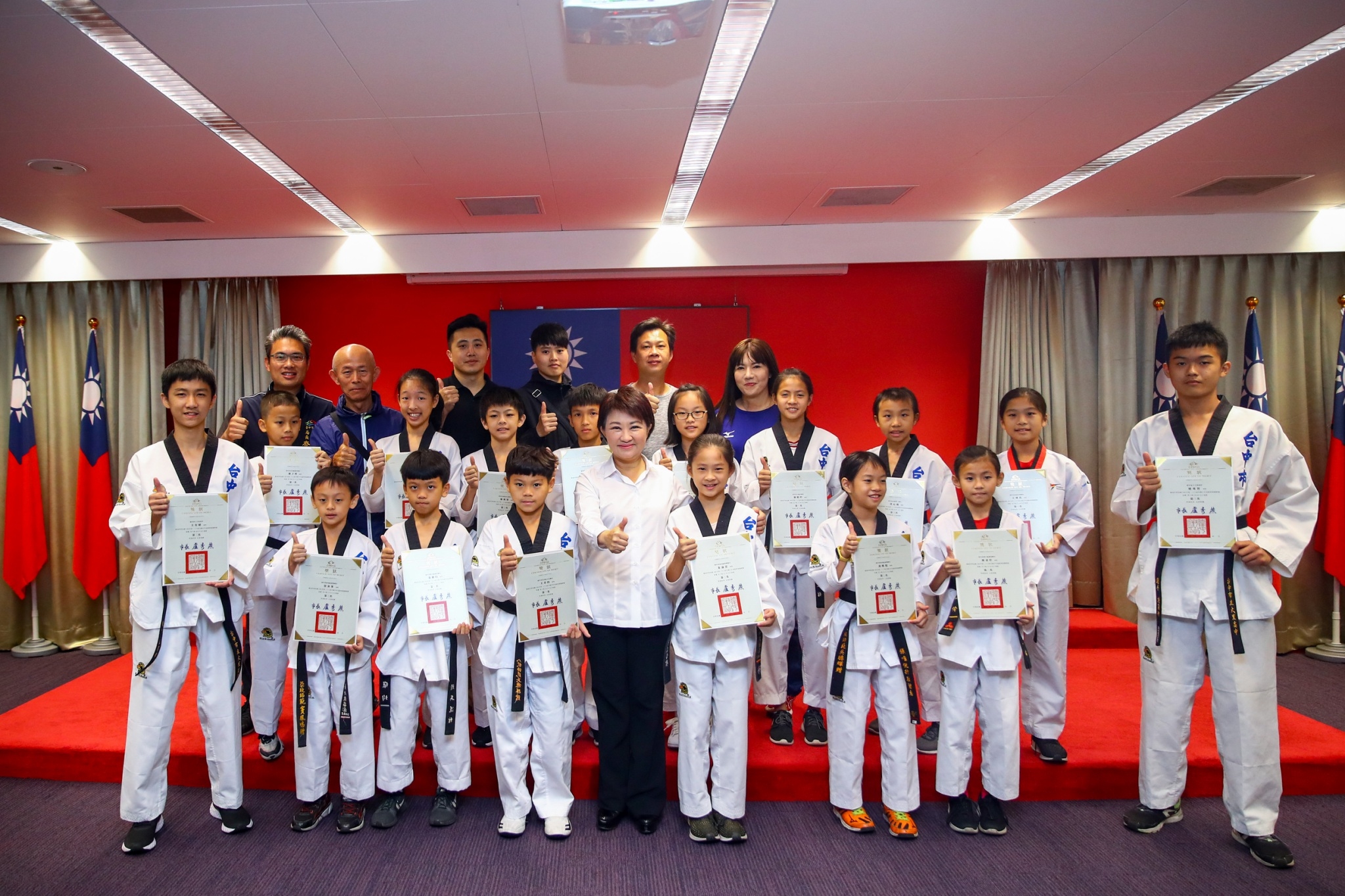 台中市跆拳道選手參加「中華民國108年第二十六屆全國少年盃跆拳道錦標賽」榮獲佳績!市長盧秀燕今(26)日於市政會議上,頒發表揚狀肯定17位獲獎優秀選手。盧市長表示,台中市運動選手成績有目共睹,市府未來將持續推動運動發展,培育更多優秀選手。