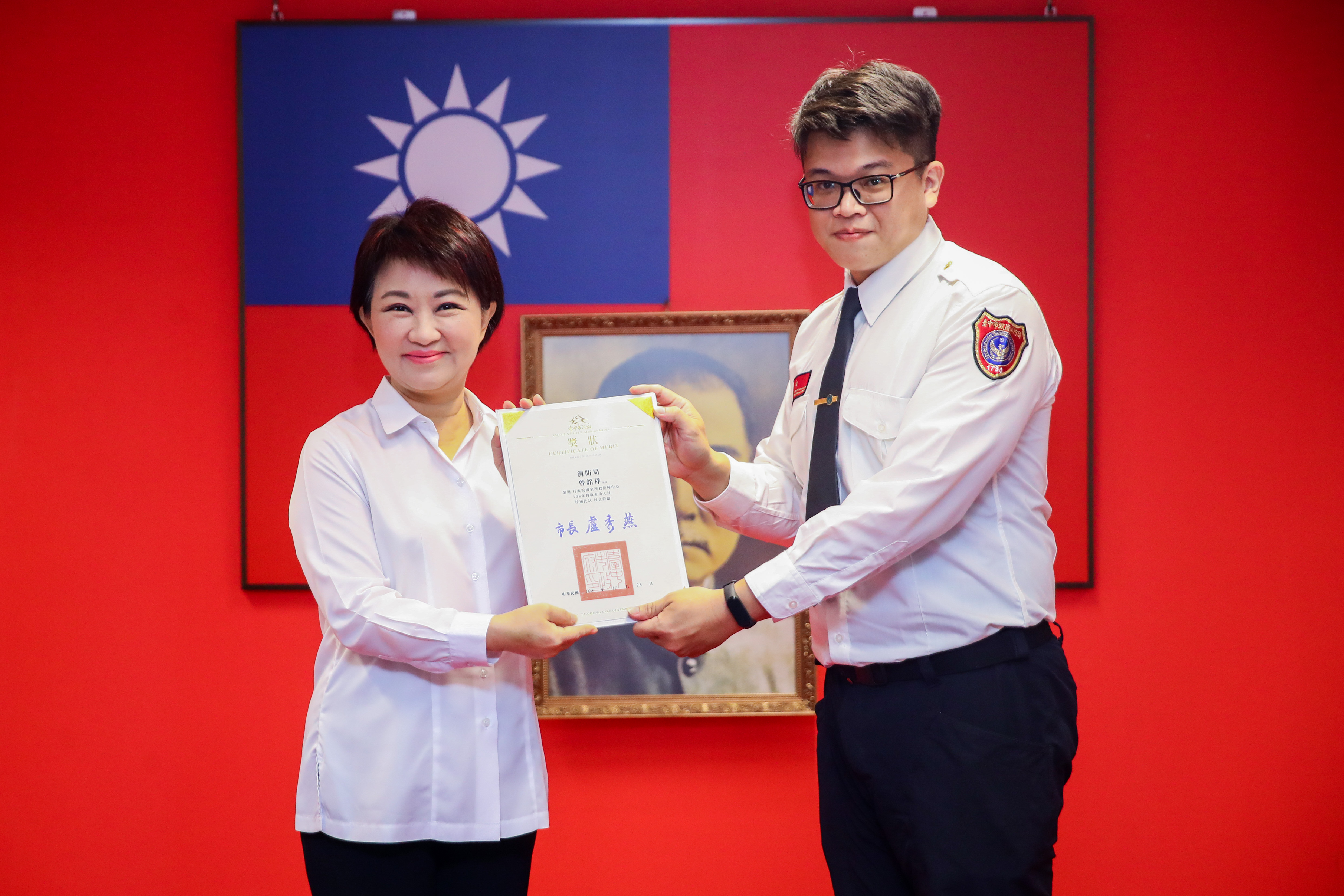 行政院國家搜救指揮中心「108年搜救有功人員甄選計畫」公布獲獎名單!台中市政府消防局科員曾銘祥從激烈競爭中脫穎而出,獲得獎項肯定。市長盧秀燕今(26)日在市政會議中頒獎表揚曾銘祥認真負責的工作精神,期許他的優秀事蹟成為榜樣,提升台中市整體消防人員工作士氣。