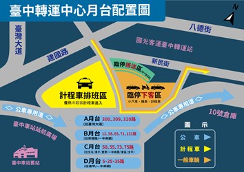 此外,原先停靠C月台的計程車排班區恢復在新民街側,D月台的汽機車臨停接送區調整至台中車站地下停車場3A入口處,新民街側的臨停接送區則調整為臨停下客區,請民眾多利用地下停車場轉乘接送。