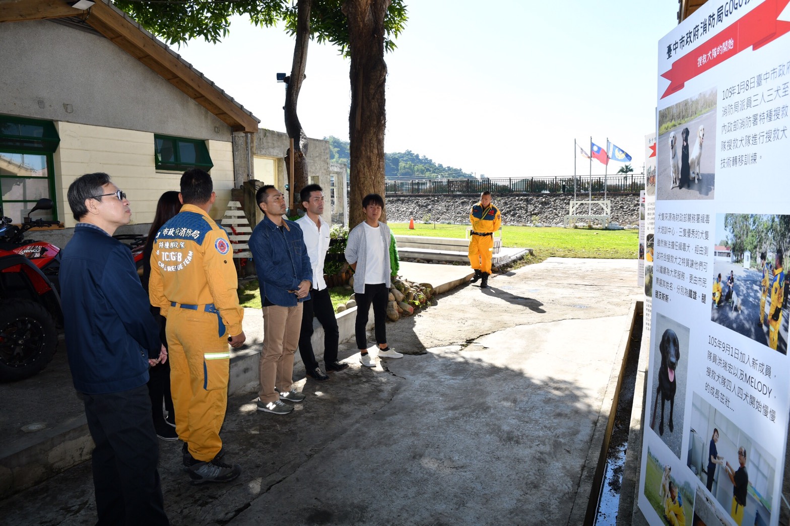 消防局表示,內政部消防署邀請日本靜岡縣消防學校教官來台,針對火災搶救指揮系統等課程互相交流,期間日方特別到台中參訪,由台中特搜大隊搜救犬隊及南屯消防分隊接待,並由台中搜救犬展示平時訓練成果,獲得日方教官肯定。