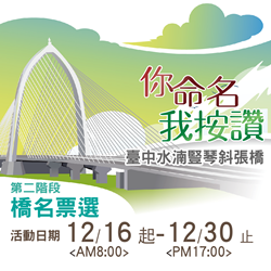 獲公共工程金質獎肯定的台中水湳景觀斜張橋即將完工,將成為中部最高的絕美新地標。台中市政府日前廣邀全國民眾發揮創意為橋命名,短短2周吸引超過2,200位民眾投稿,最後入圍「中科經貿大橋」、「科湳愛琴橋」、「科湳翼豎大橋」、「弦鳴橋」及「希望之星橋」5件橋名,即(16)日起至12月30日進入第二階段網路票選,只要到網站為最喜愛的名稱按讚,就有機會抽中1,000元禮卷,歡迎把握機會參加!