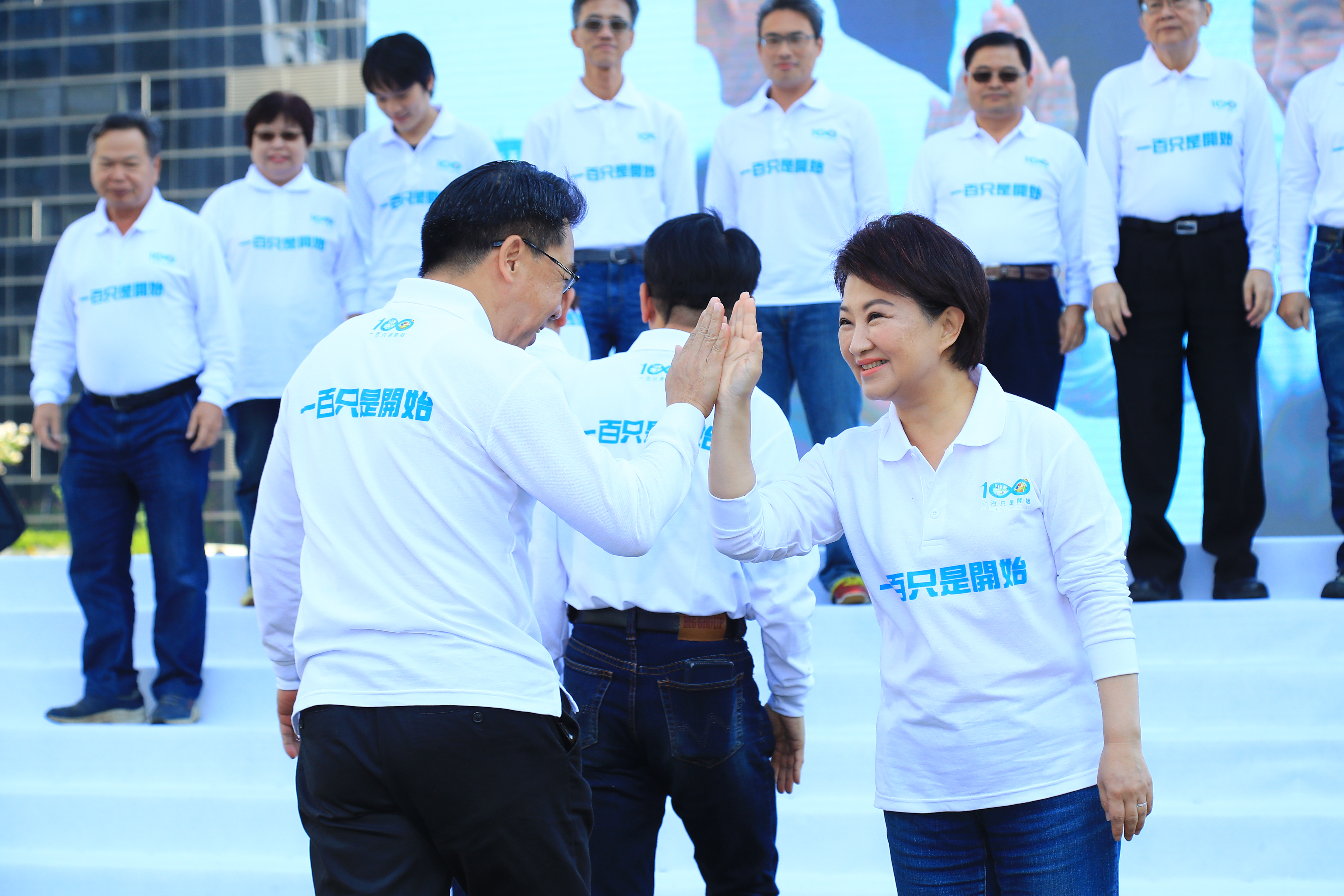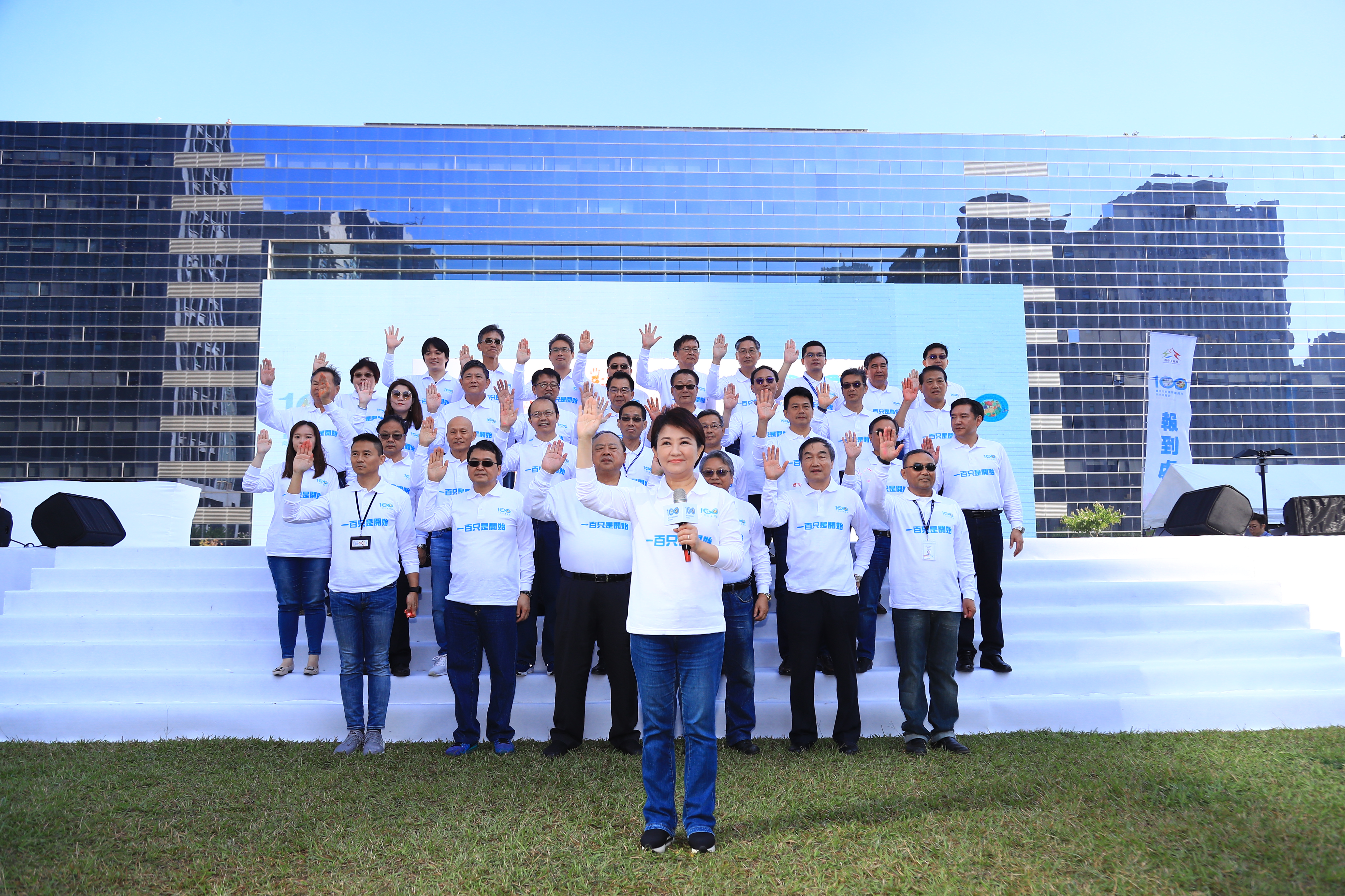 台中市政府於市政公園舉行就職周年活動,現場豔陽映著滿地綠意,盧市長與副市長令狐榮達、陳子敬、各局處首長一一擊掌,感謝他們及市府同仁這1年來的辛勞。接著她攜手市府團隊在台中市花「山櫻花」畫作上,蓋上手印、一起完成作品,承諾守護台中,創造大台中幸福家園。