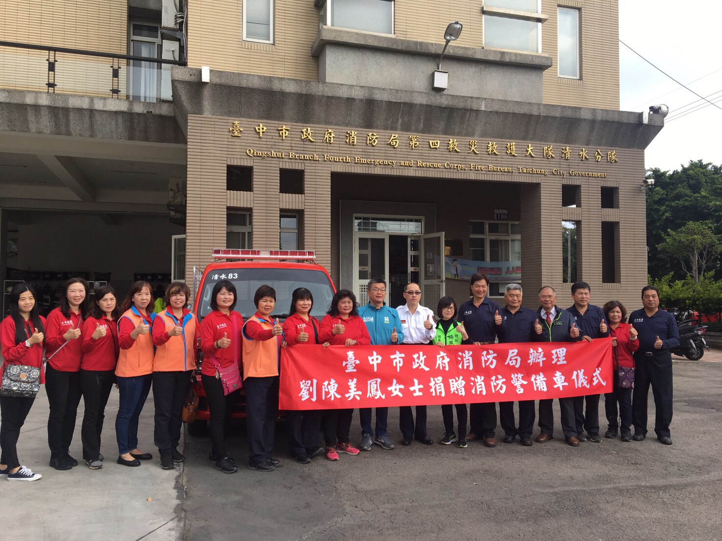 台中市民劉陳美鳳長期關注消防勤務,為感謝台中消防人員救災辛勞,捐贈市府消防局一輛消防警備車,車型為2019年式卡旺大單廂車輛,可執行山域勤務及救溺勤務,機動性高、救災功能齊全,將提供清水分隊使用,今(19)日在該分隊舉辦捐贈儀式,由消防局第四大隊長蔡孟栩代表受贈、頒贈感謝狀,感謝市民的愛心,市府將善用消防設備,守護市民安全。