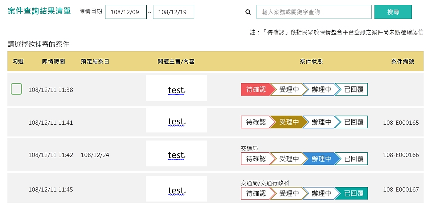 研考會指出,陳情整合平台上新創的案件處理流程進度可分為四階段,民眾於陳情整合平台登錄案件後,須至個人信箱點選確認信,此為第一階段「待確認」(紅色);在民眾完成確認後,分派到承辦機關之前,為第二階段「受理中」(褐色);當案件分派到承辦機關開始處理後,則為第三階段「辦理中」(藍色),等到機關處理完畢結案時,狀態則為第四階段「已回覆」(青色)。