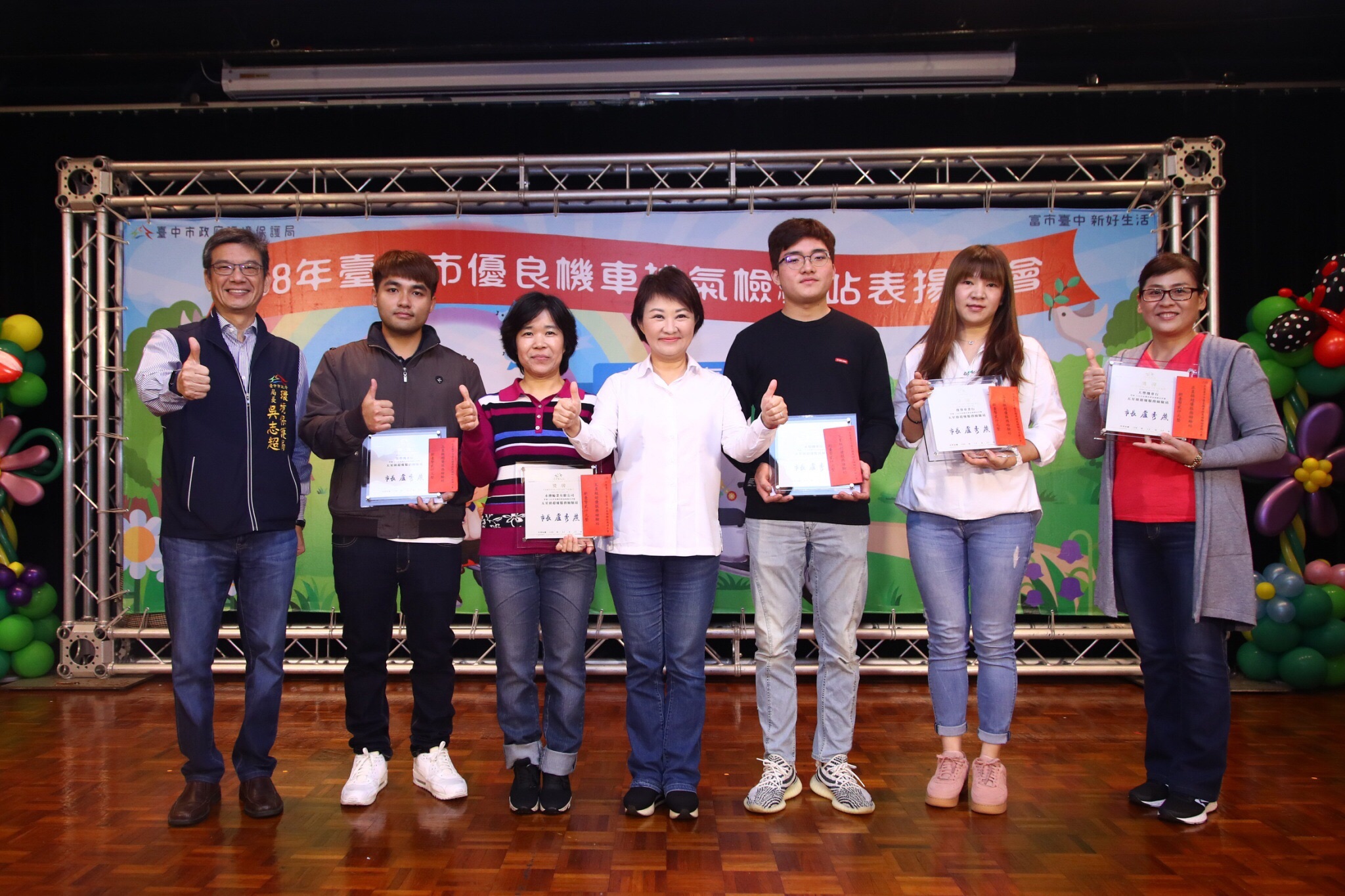 盧市長也說,台中市積極配合環保署政策,二行程機車淘汰率六都第一、機車定檢率六都第二,表現優異。她依序頒發「汰舊卓越獎」、「機車檢驗數進步獎」及「五星級超優服務檢驗站」獎牌及獎金,表揚優良業者。