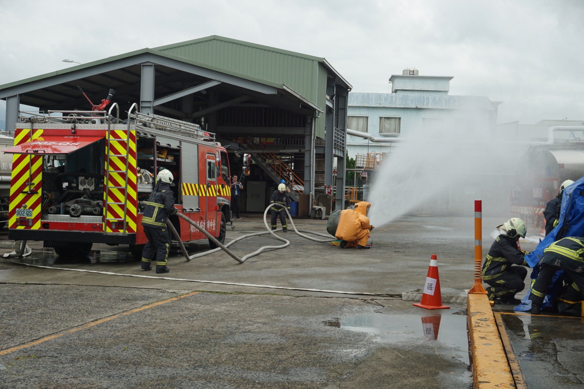 此外,環保局也於大甲工業區結合在地廠商辦理毒性化學物質複合式災害應變防救示範演練,藉由演練達到「事前預防、事中應變、事後復原」目標,提升災害應變效率。