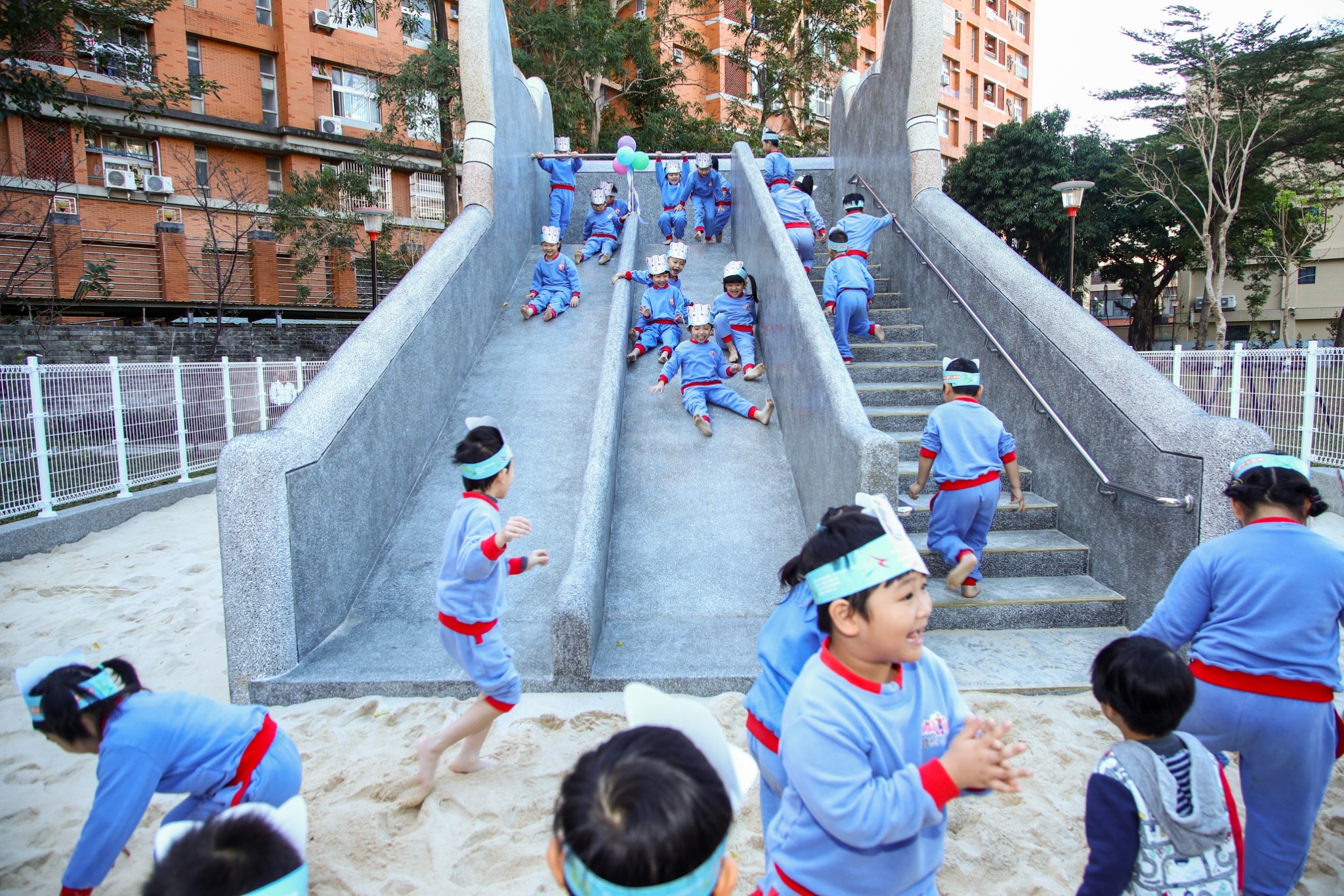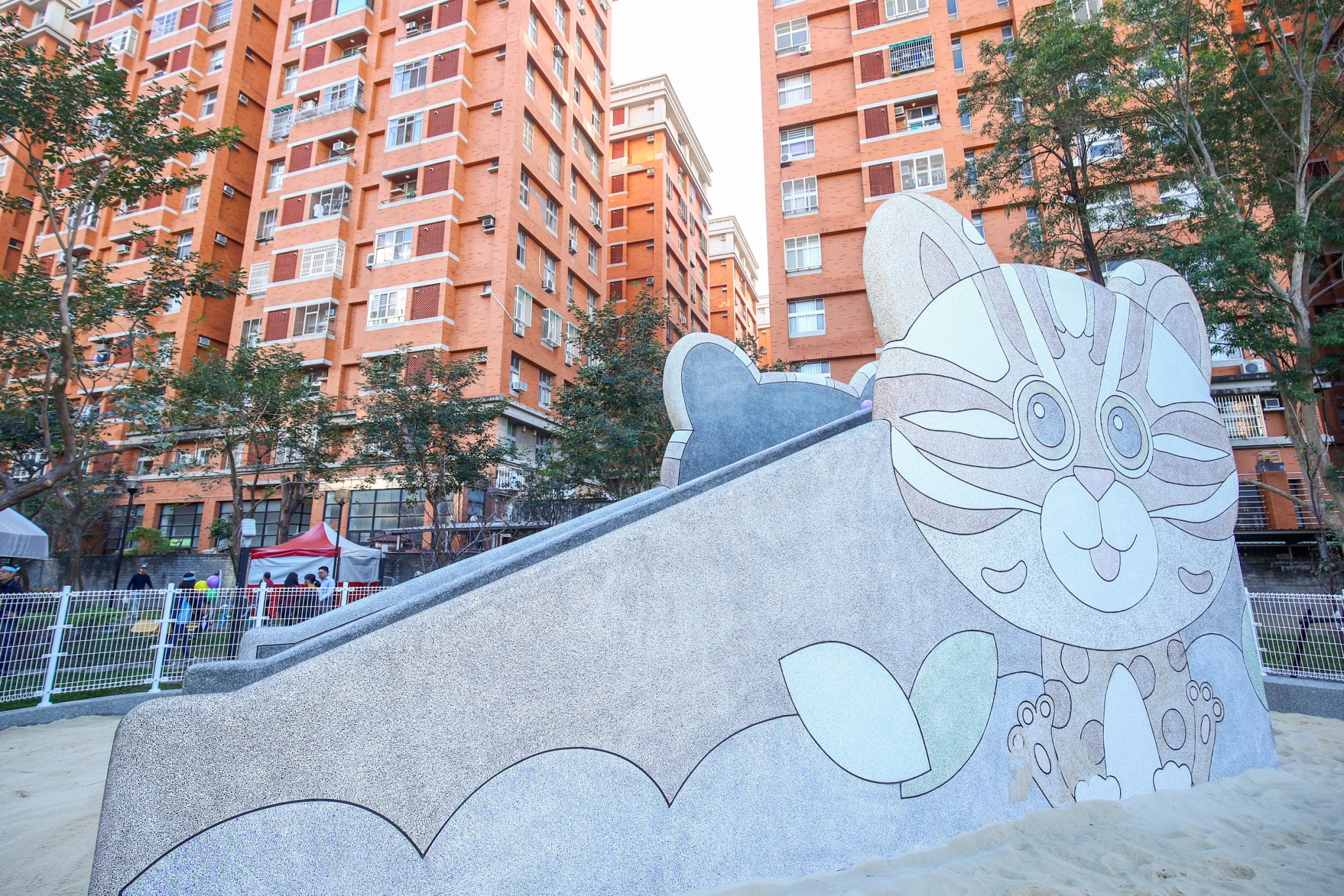 南區永興公園西側原為海巡署中巡局台中機動查緝隊辦公廳舍,在搬遷後由台中市政府建設局開闢該地約1,700平方公尺,並結合既有公園約1,600平方公尺,讓公園面積增加一倍!今(26)日完工並對外開放,園內還設置石虎圖騰溜滑梯、白沙坑及水畫牆,吸引許多小朋友遊玩,現場充滿歡樂笑聲。