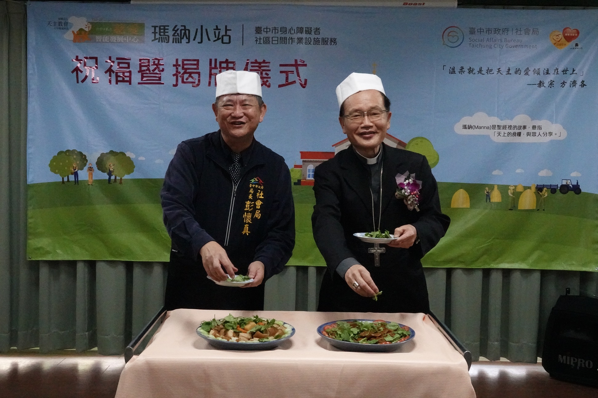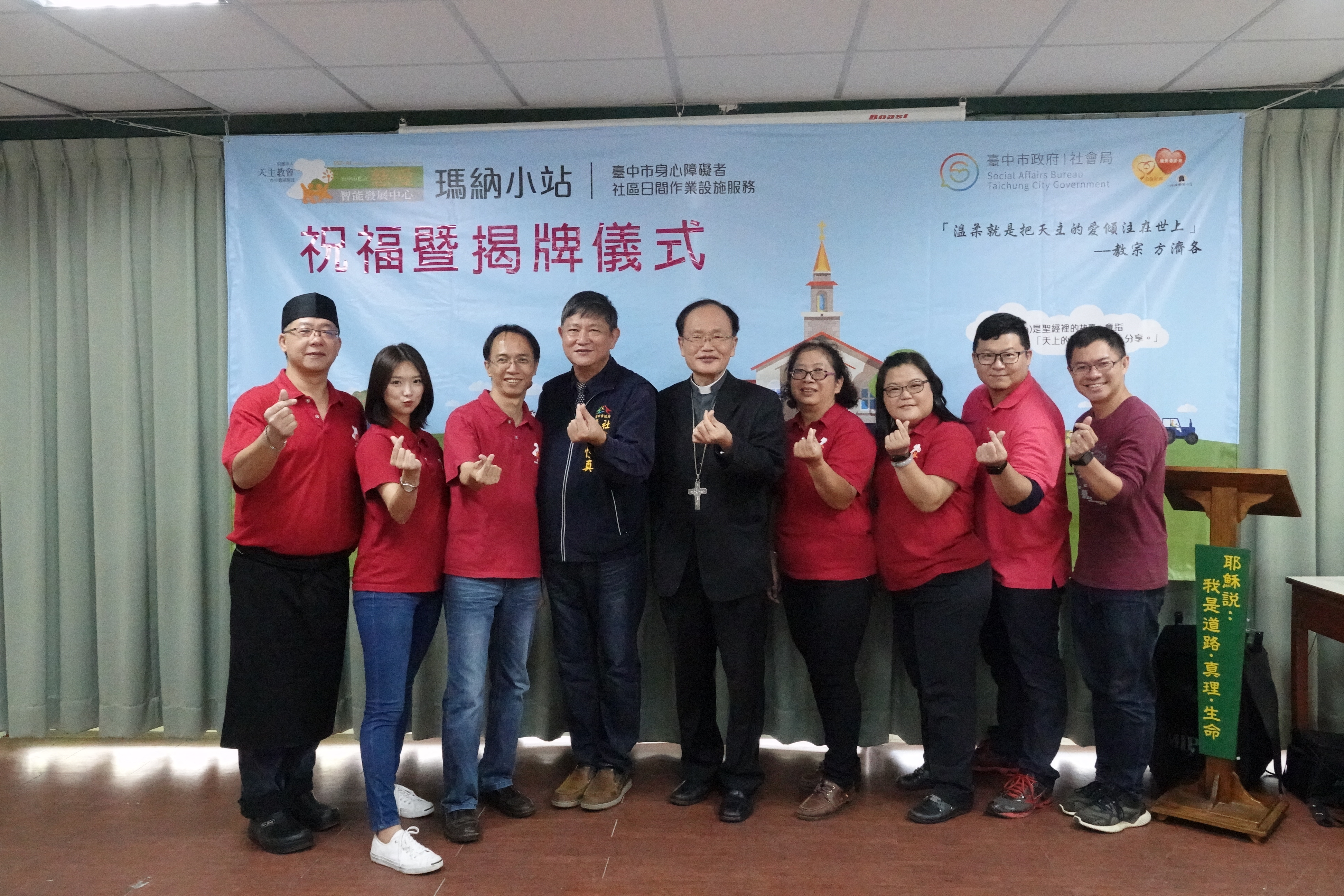 身心障礙者社區日間作業設施「瑪納小站」揭牌儀式在天主教會台中教區主教公署舉辦,社會局長彭懷真出席活動時表示,看見身障者的需要,市府運用台中市公益彩券盈餘分配基金於北區開辦小作所,提供身心障礙者「作業活動為主、文康休閒為輔」的服務,持續與社區互動、學習就業技能。