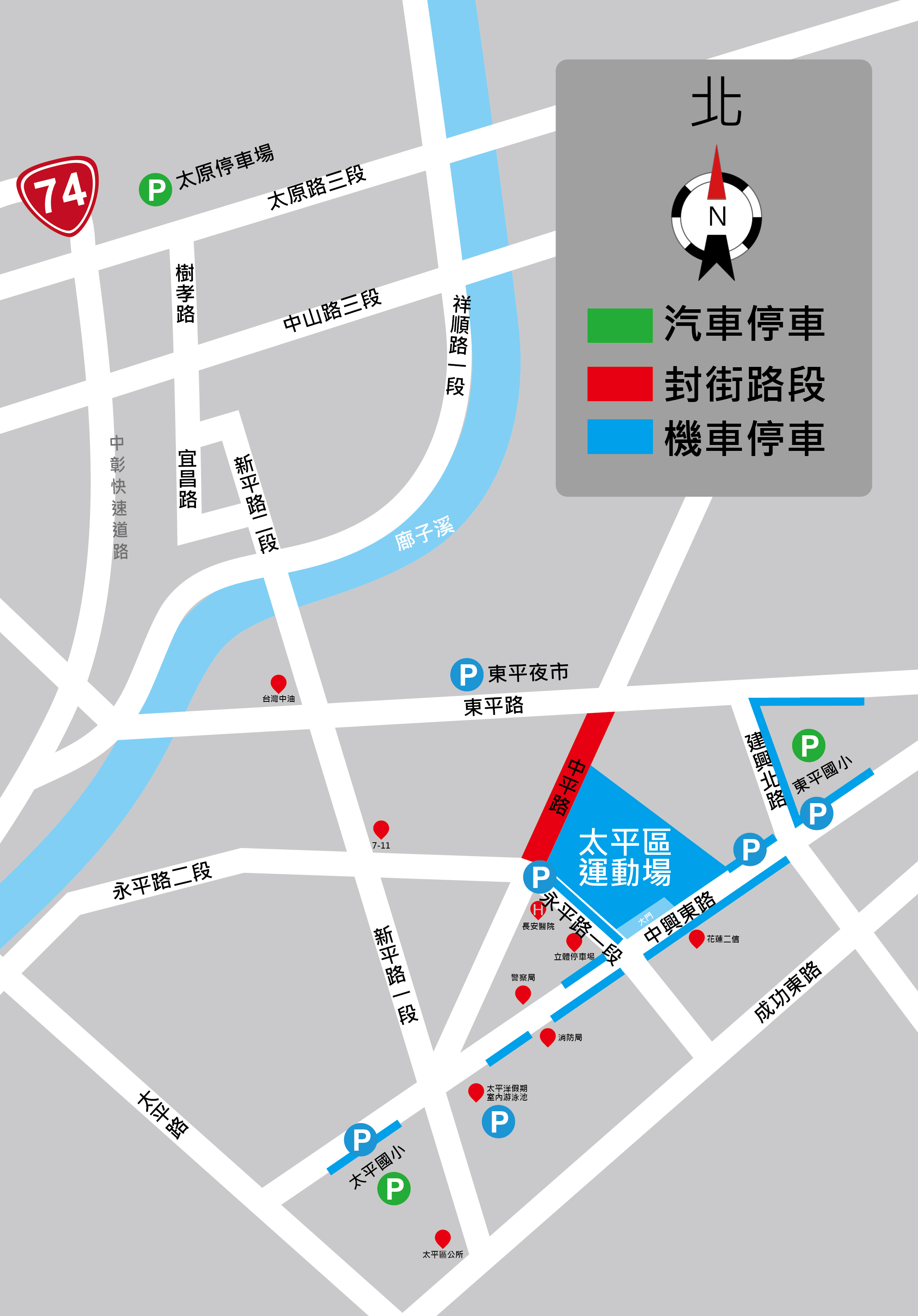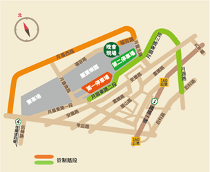 在「太平現場」太平運動場方面,中平路(東平路至永平路段)全段雙向路側於31日中午12時開始禁止停車至隔日凌晨1時30分,並於31日下午5時至隔日凌晨1時30分進行封路管制。