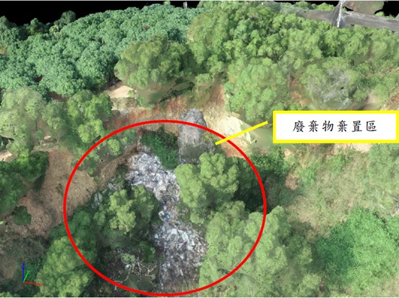 據空拍影像顯示,該垃圾棄置總面積約有671平方公尺,並採3維影像計算棄置廢棄物的堆置量體,不僅可免除稽查人員於吊掛作業的危險,也提高量測及估算結果精準度,未來將逐步推廣使用,而全案調查資料已移送台中地檢署偵辦,接續該局也會要求行為人負起清理責任。