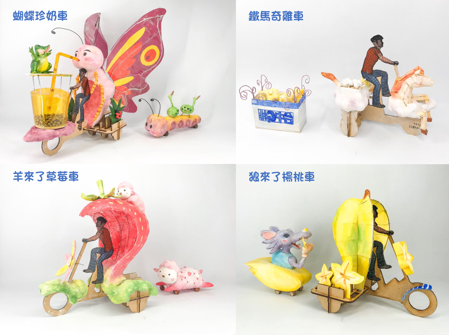 「蝴蝶珍奶車」及「鐵馬騎雞車」結合台中自然與人文特色,跳脫蝴蝶吸花蜜印象,改成吸台中名產珍珠奶茶,並以鐵馬造型後面拖著一台雞排車做趣味連結;此外,「羊來了草莓車」、「狼來了楊桃車」,以「羊來了,草沒」、「狼來了,羊逃」打造可愛逗趣形象。