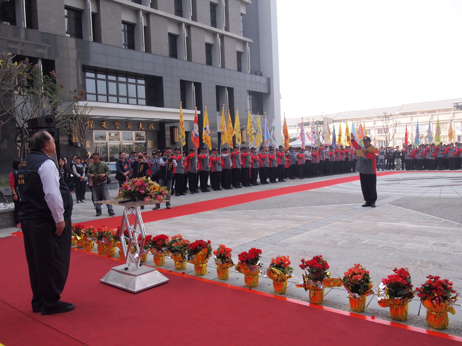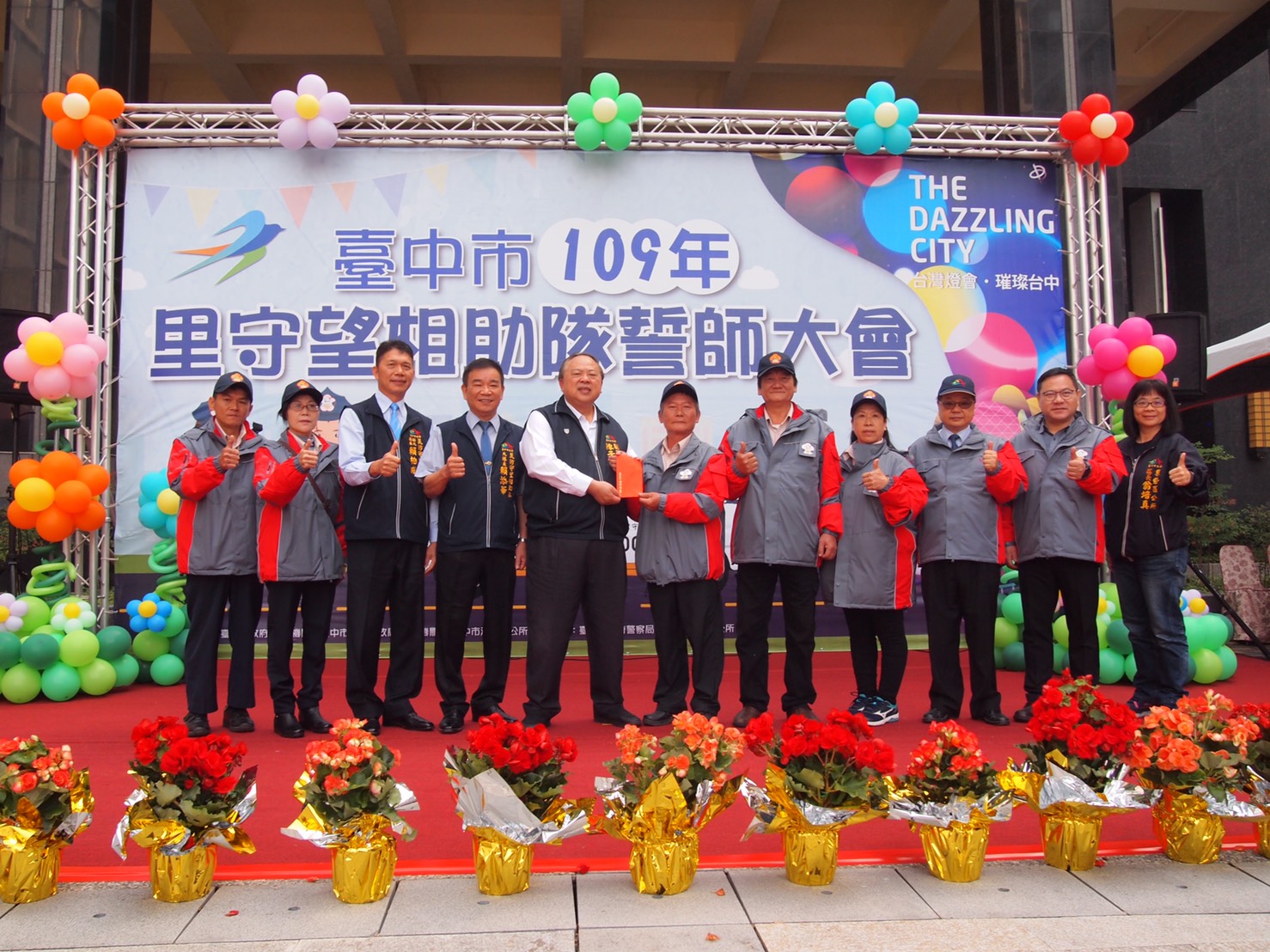 民政局吳局長指出,台中市有230隊里守望相助隊,約1萬2,000位巡守隊員,市府以「福利從優」原則,支援里守望相助隊隊員保險、巡邏工作必要支出及裝備費用,去年底全面換發輕量保暖的禦寒巡邏大衣,也補助新購或汰換巡邏汽、機車,希望讓這群為治安奉獻心力的基層巡守尖兵,全心投入社區服務,感謝他們對台中治安的貢獻。各區區長及市議員陳成添等人今日均到場共襄盛舉。(1/4*7)*民政局