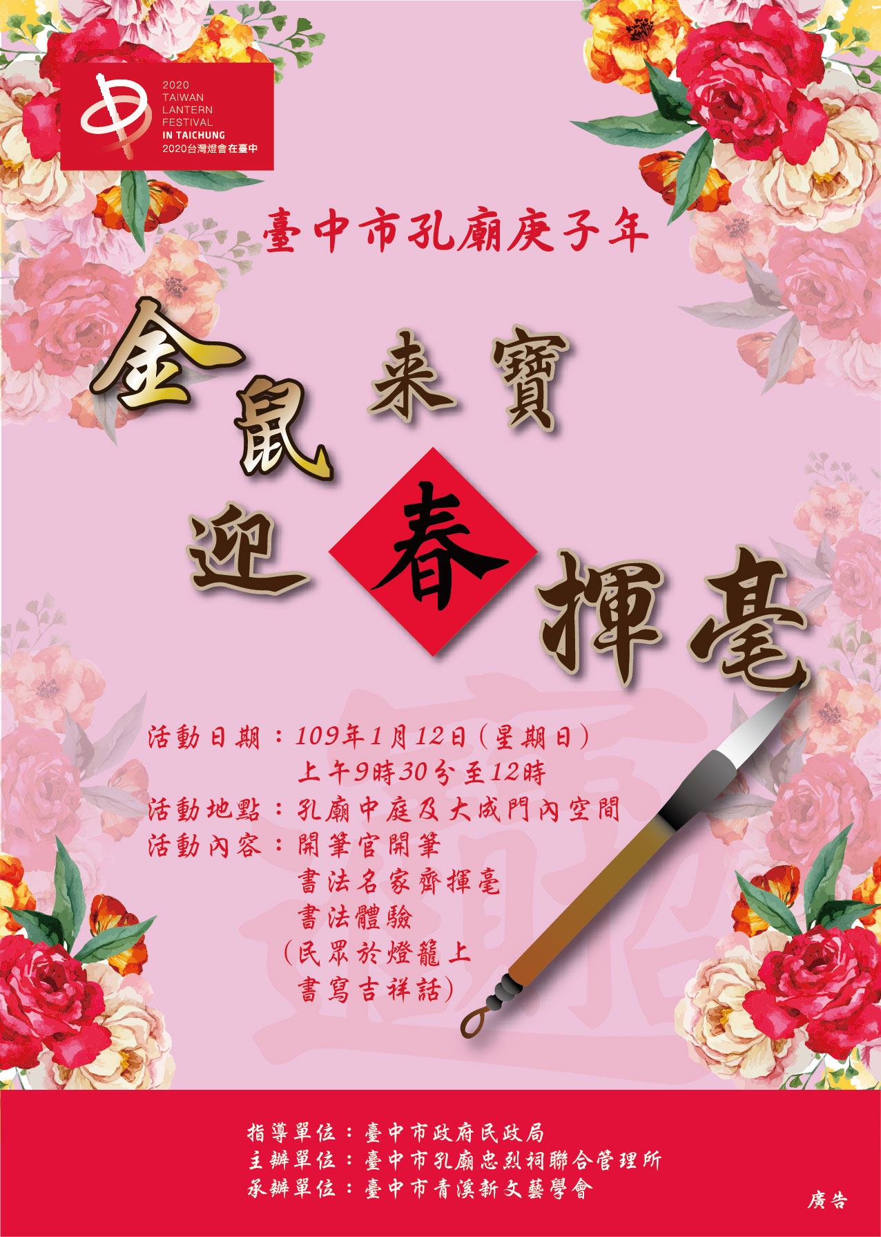 台中市孔廟將於1月12日上午9時至12時在中庭舉行「金鼠來寶‧迎春揮毫」,除邀請逾20位書法名家現場寫春聯、畫年畫,更響應2020台灣燈會加碼發放小紅燈籠,歡迎民眾踴躍參加。