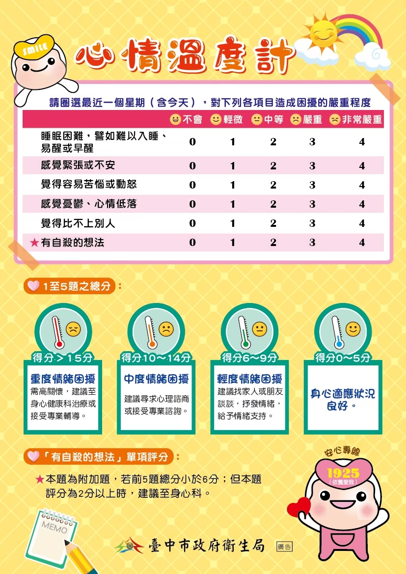 衛生局長曾梓展表示,每個人在生活中總會遇到挫折、失落或難以克服的關卡,如有需求,歡迎向各區衛生所預約免費心理諮詢服務,或撥打24小時免費安心專線1925(依舊愛我),由專人聆聽心聲並提供心理、情緒支持與關懷。另外,衛生局心理健康網自我檢測區(http://bit.ly/2rA3cK5)也有「心情溫度計(簡式健康量表)」提供民眾檢測情緒、評估心理健康狀態。(1/9*23)*衛生局