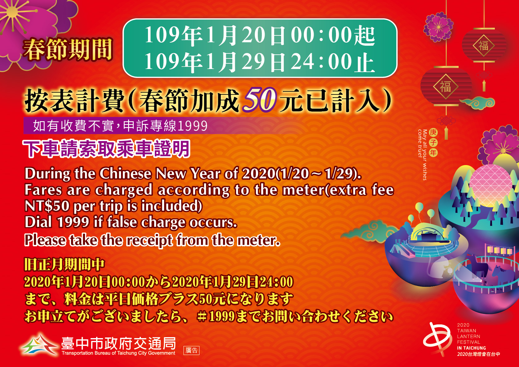農曆春節即將到來,計程車駕駛持續提供服務,凡在台中市搭乘計程車,自1月20日(除夕前三天)凌晨零時起至1月29日(大年初五)24時止,全日計程車一律啟用「春節費率」,即每趟次加收50元,比照往年春節收費標準,1月30日(初六)起恢復原規定收費。