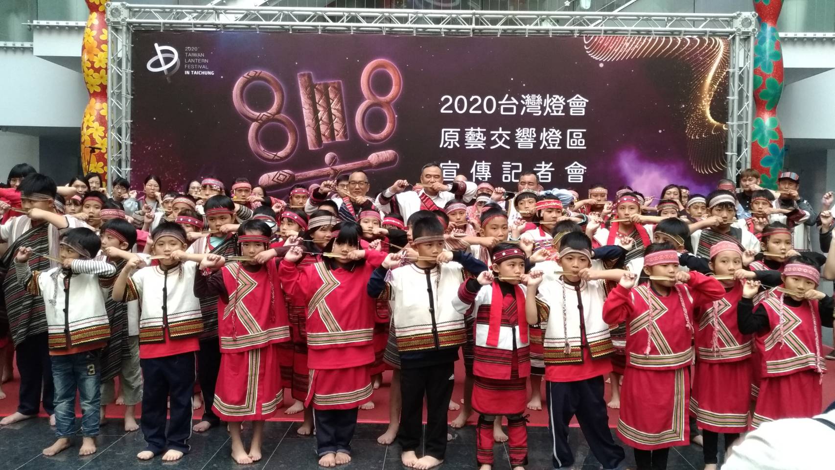 市府原民會今(16)日於台灣大道市政大樓舉辦「原藝交響燈區」宣傳記者會,邀請台中市和平區博屋瑪國小及和平區部落耆老共109位齊奏泰雅族口簧琴古調,為原藝交響燈區拉開序幕,現場吸引不少民眾駐足聆聽,感受富含原民文化的音樂饗宴。