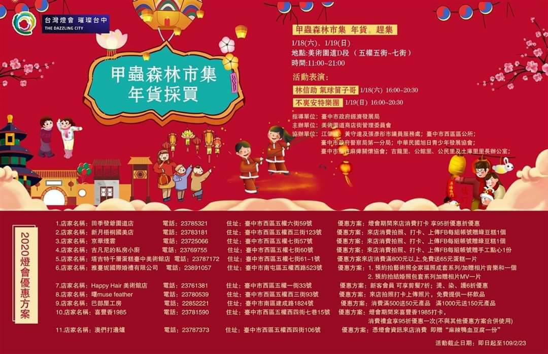 台中市政府經發局輔導美術園道商圈規劃「甲蟲森林市集」,以環保減碳、戶外夜晚無插電為主題,將於明(18)後兩日上午11時至晚上9時在美術園道D段(五權五街~七街)舉辦年貨採買活動,並推出2020台灣燈會優惠方案,包括指定商店消費打卡打95折或贈送來客禮,歡迎民眾踴躍消費。