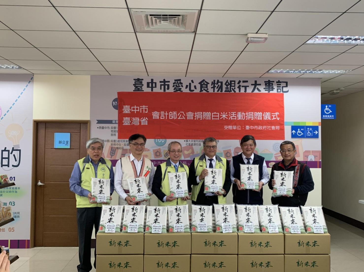 為讓弱勢民眾過好年,台中市會計師公會理事長蕭珍琪與台灣省會計師公會理事長黃協興,日前代表會計師公會捐贈愛心食物銀行大里店白米3,000包,由社會局長彭懷真代表受贈,白米將於春節前,透過社會局溫馨快遞活動,發放至有需要的民眾及社福單位手中,傳送愛與關懷。
