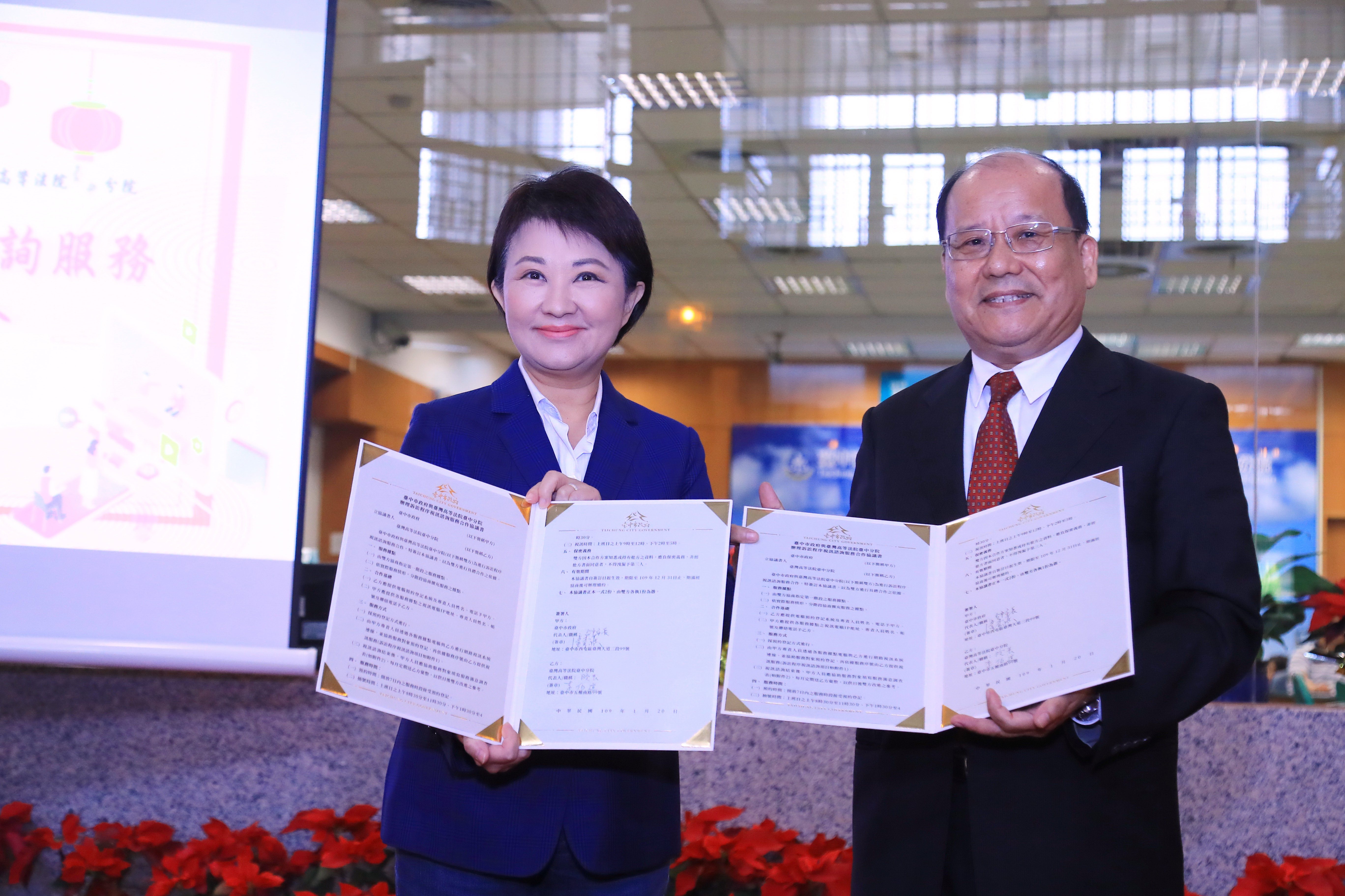 台中市政府與台灣高等法院台中分院合作,今年除啟用訴訟程序視訊諮詢服務,也擴大服務範圍至第二審級訴訟程序,今(20)日簽訂「辦理訴訟程序視訊諮詢服務合作協議書」,市長盧秀燕表示,視訊諮詢服務與在地區公所合作,免除市民舟車勞頓,市府將完善行政程序和法律措施,做到「有備無患」!