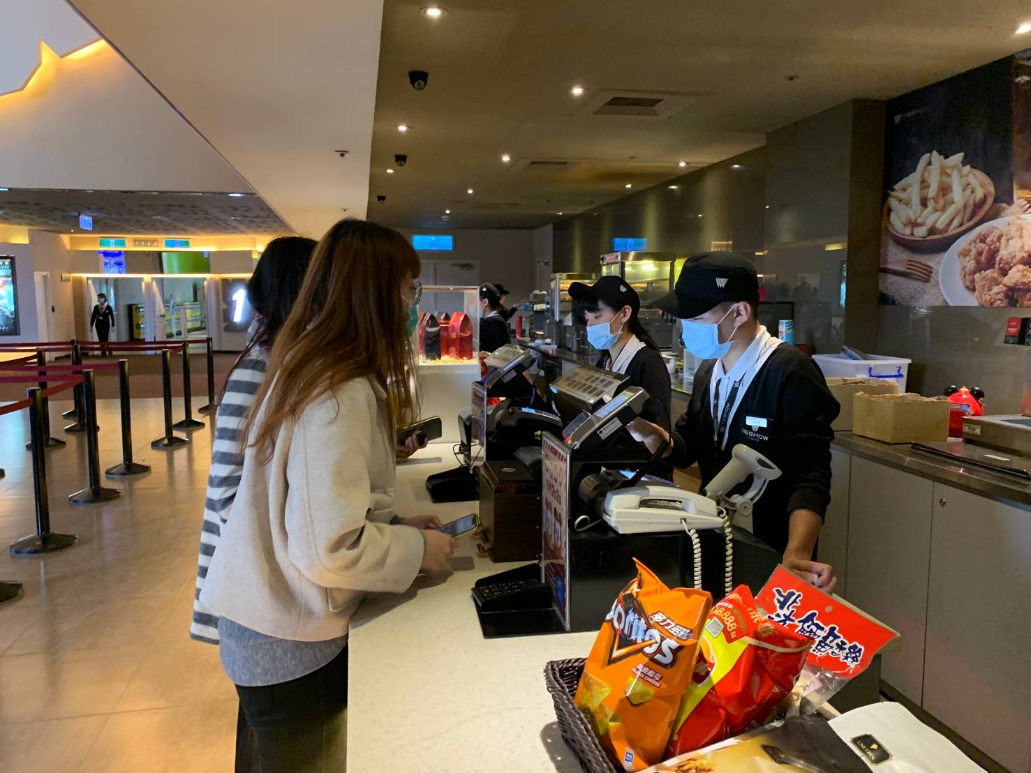 電影院服務人員戴口罩做好防疫措施