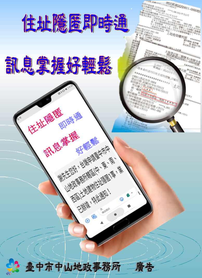 民眾申請土地登記謄本,可臨櫃或使用自然人憑證申請隱匿部分住址資料,以保護個資,台中市中山地政事務所為優化服務,受理完成後會主動發送簡訊,讓民眾輕鬆掌握申辦狀況,提升服務品質。