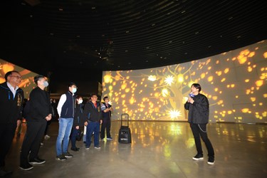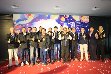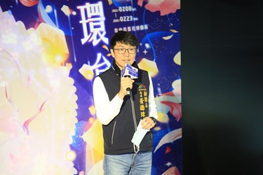 新聞局今(4)日在台灣燈會后里馬場園區花舞館舉辦「環·台中光影燈區」搶先看記者會,現場安排工作人員在入口處為來賓進行酒精乾洗手消毒,也提醒進入記得戴口罩,記者會由新聞局長黃國瑋主持,並與此燈區負責操刀的Hexogon Solution(賀喜娛樂有限公司)創意總監黃清毅、Hexogon Solution總經理田恩沛等人共同介紹燈區特色。