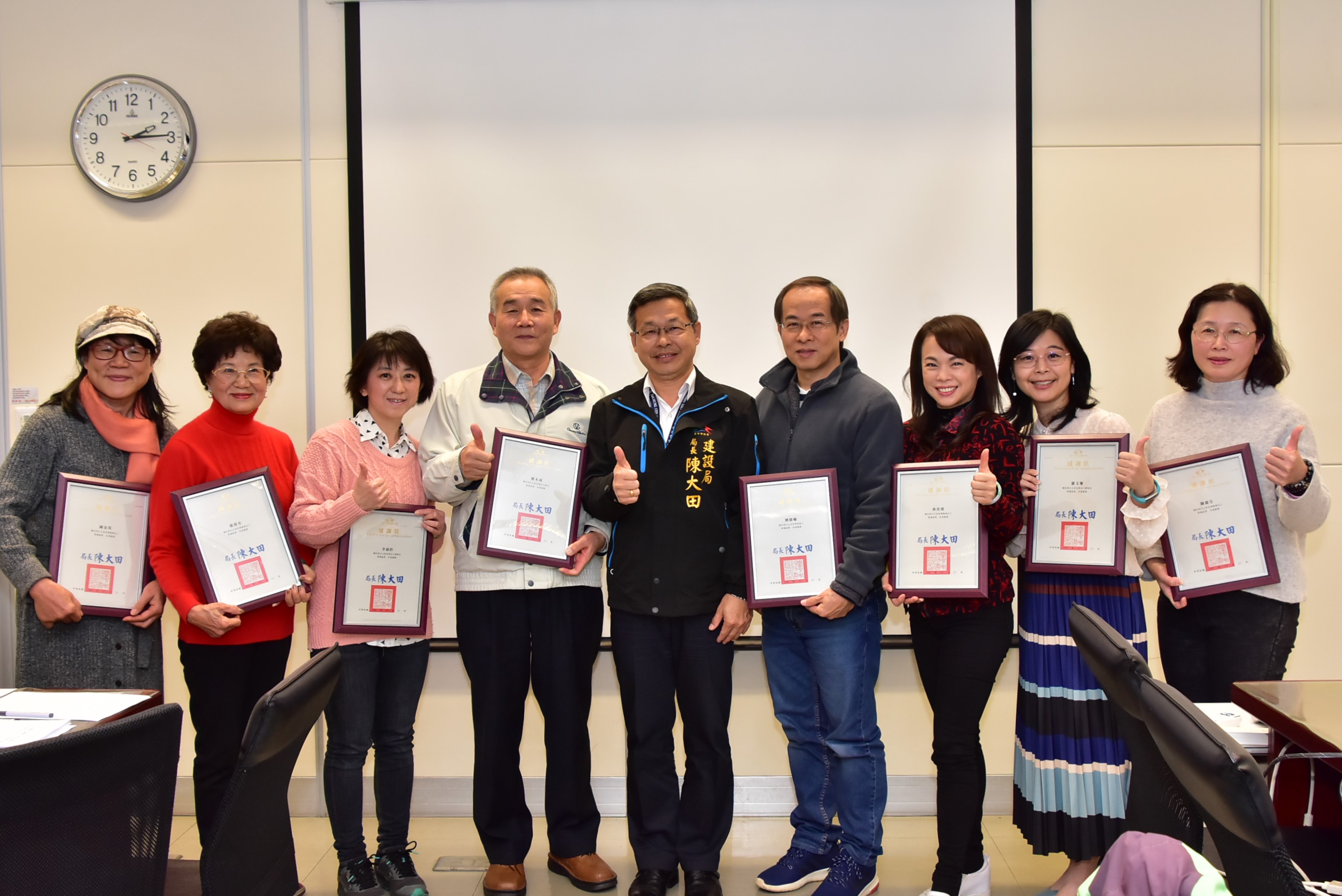 今日包括策展人劉德輔、志工組長鄭木成、副組長李淑玲、翁嬪玲、羅文珊、志工林佳臻、陳麗芬、施淑女、鍾金英等9人均出席接受表揚,副組長林文惠、志工朱穆桂、陳幸惠代表也出席受獎,並在會中簽署中央公園志工招募申請書,延續服務的溫度。