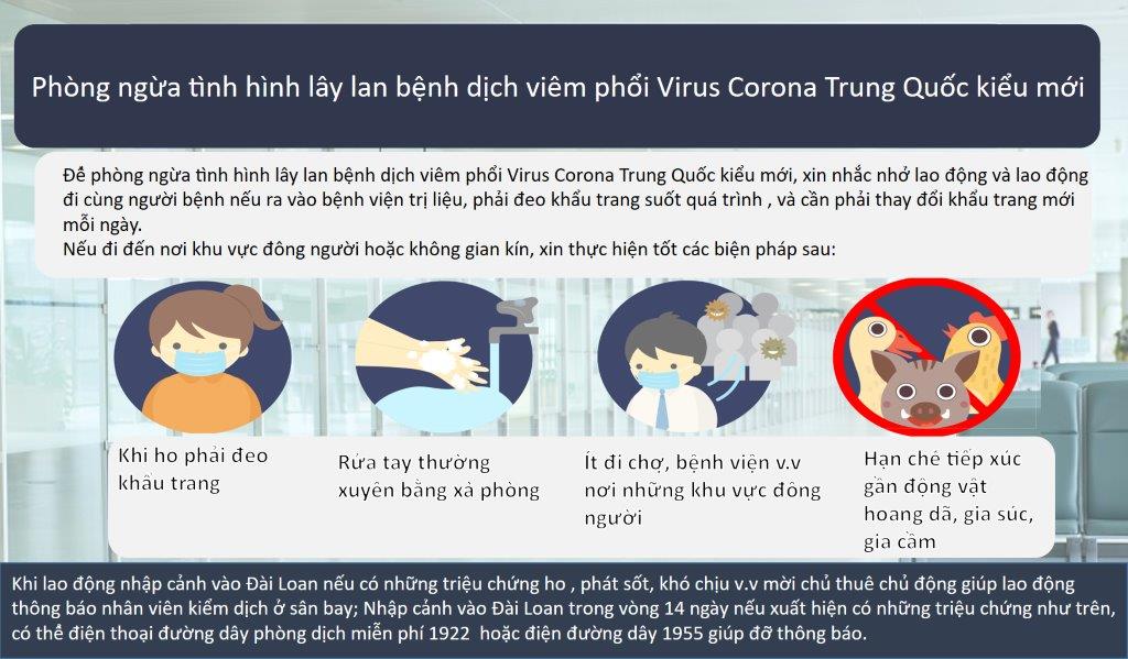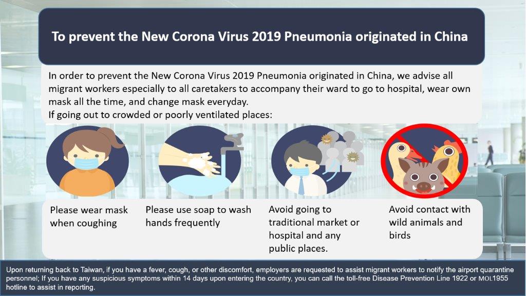 鑒於年節期間有許多移工返鄉渡假,台中市政府勞工局長吳威志提醒,移工自國外入境時,如有發燒、咳嗽等不適症狀,應主動通報機場檢疫人員,也請雇主協助關懷移工身心健康狀況,主動提供相關防疫資訊及必要用具,若移工入國14天內出現疑似症狀,請雇主協助移工撥打免付費防疫專線 「1922」(或0800-001922)或「1955」專線通報。