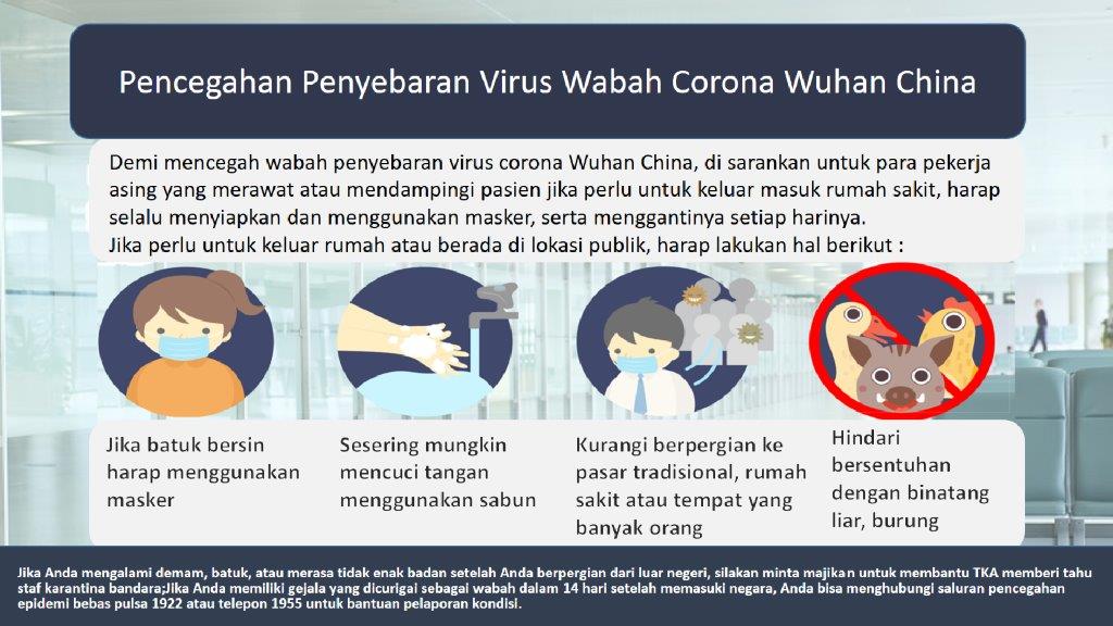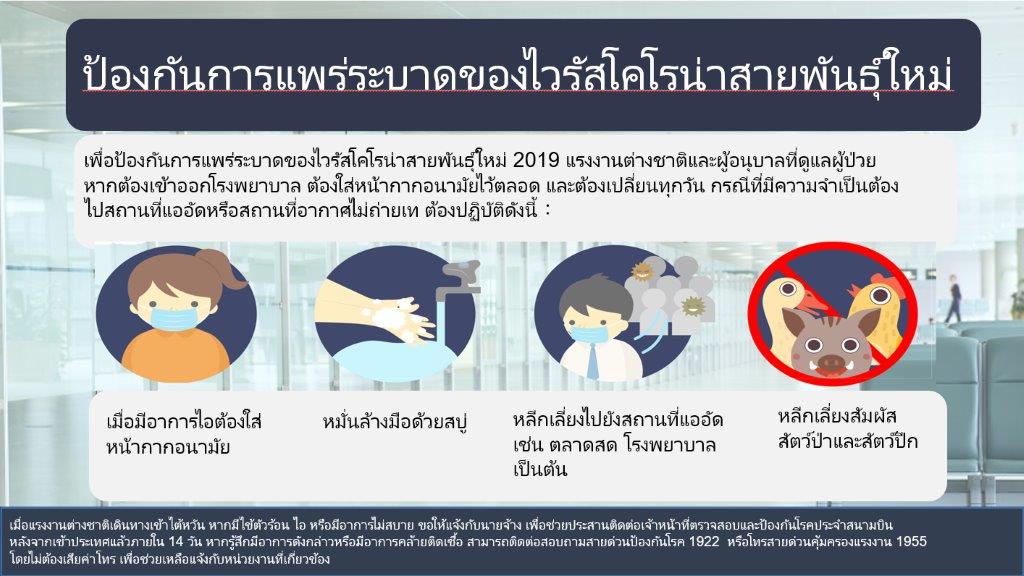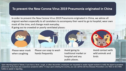 吳局長表示,移工如需出入醫療院所,包含前往醫療院所照顧被看護者或陪伴就醫,請雇主提供口罩供移工使用;且應做好咳嗽戴口罩、肥皂勤洗手、少去傳統市場、醫院等人多場所、避免接觸野生動物、禽鳥等。