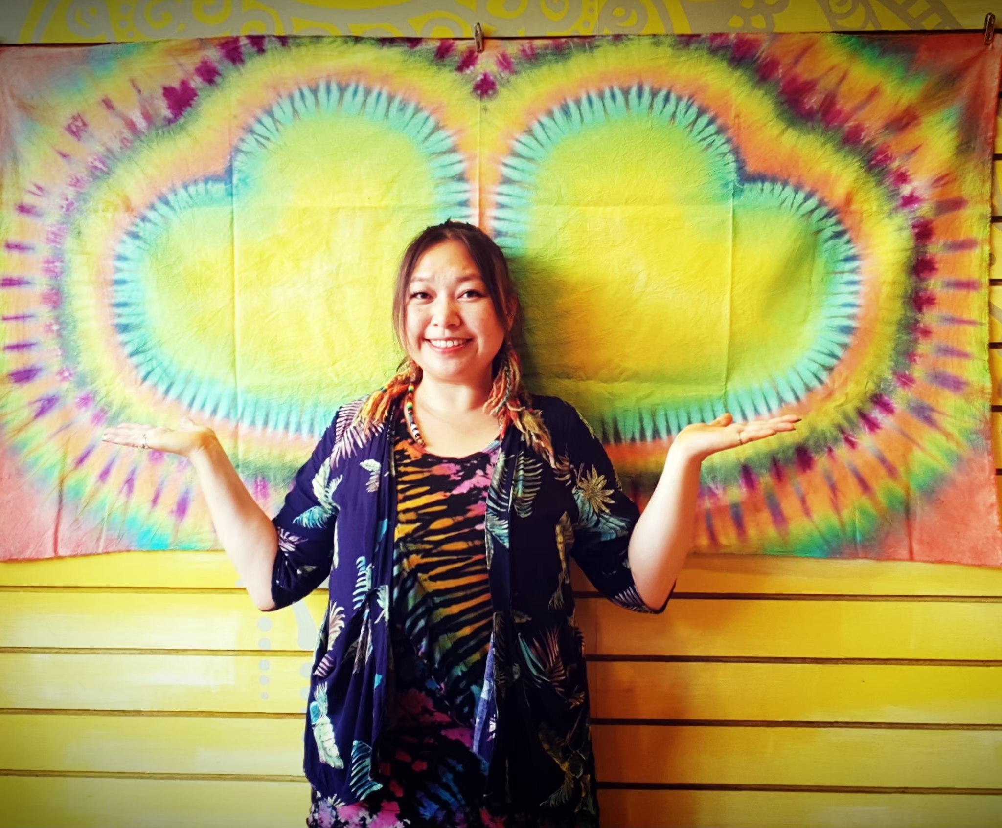 這次燈會的大型藍染作品以石岡水壩為主題,染布藝術家何佳豫首次挑戰5.5公尺長的藍染手工創作,以細纖維布料展現石岡水壩潺潺流水的形象,並運用4至5階不同深淺的顏色分層染色,希望讓大家感受水壩的壯闊。