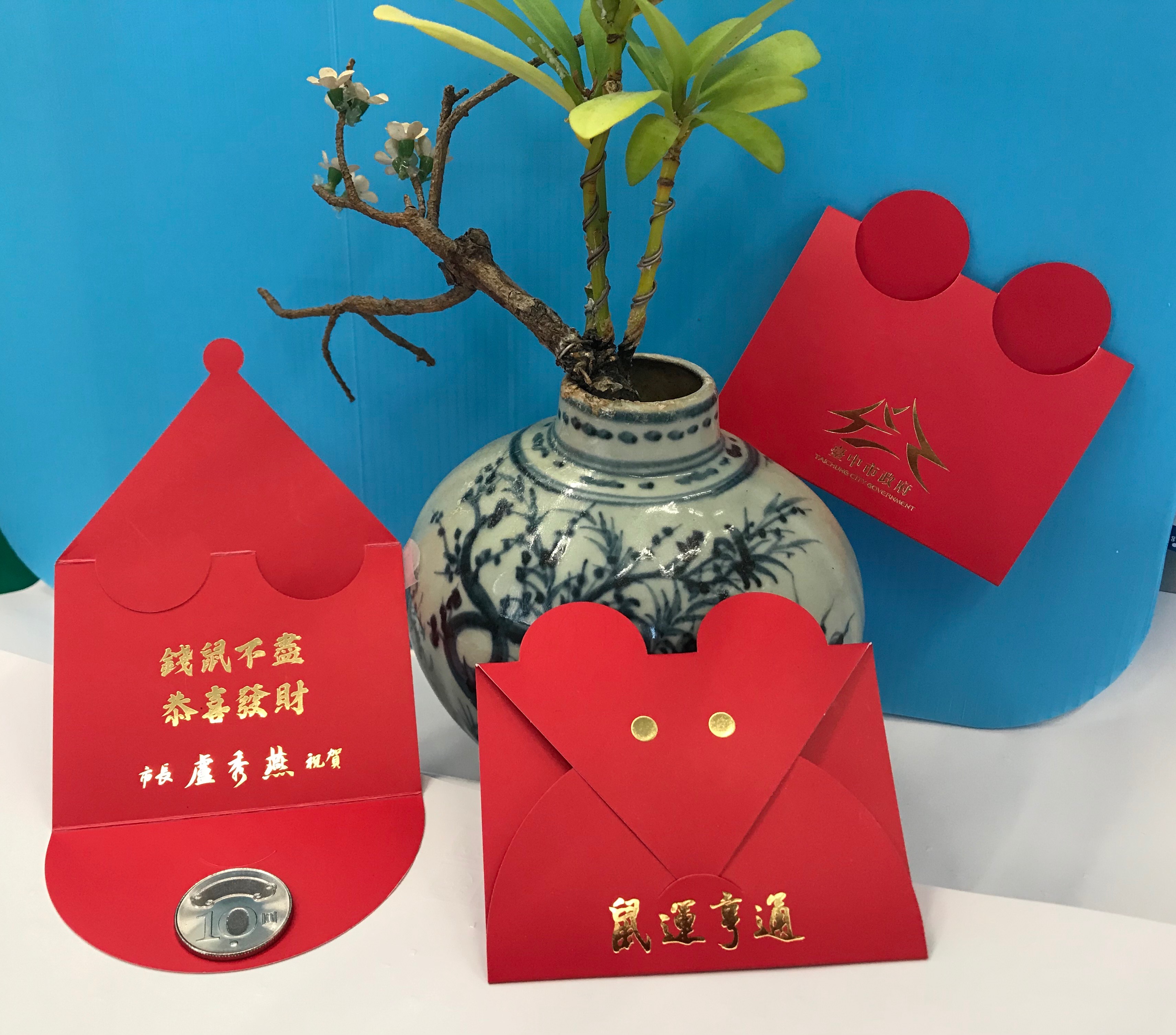 市府秘書處表示,今年是庚子鼠年,小紅包以錢鼠為造型,象徵財運到來,打開卡片後,將收到市長盧秀燕「錢鼠不盡、恭喜發財」祝賀,經過簡易折疊,可立於桌上或收藏;內嵌的十元硬幣代表「十全十美」,期盼收到的人富貴滿滿、豐收賺大錢。