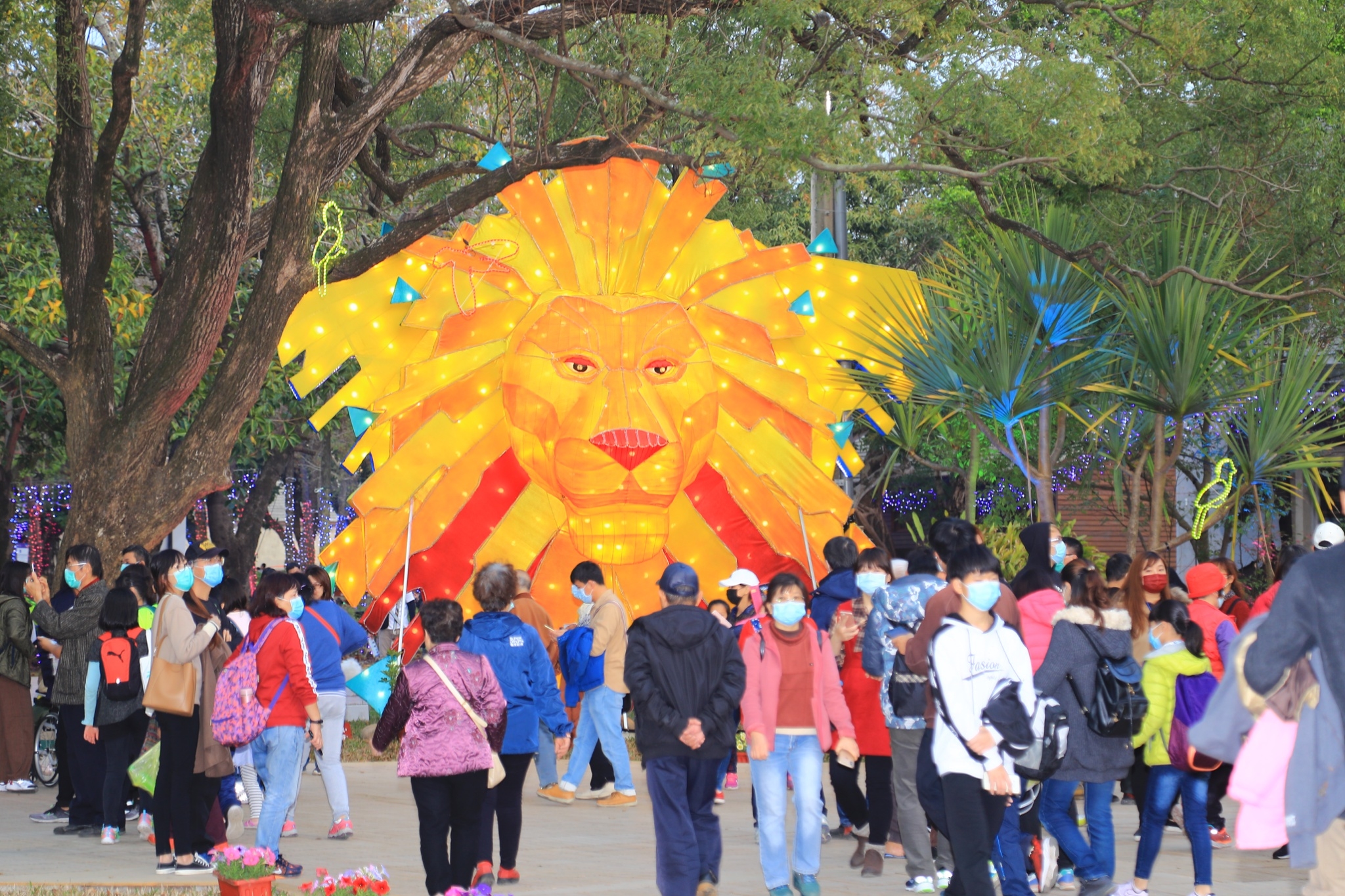 以動物為主題的「動物狂歡嘉年華燈區」在后里馬場園區,「萬獸之王」獅子戴著華麗的面具,帶領大象、腕龍、羊駝等動物盛裝出席台灣燈會,成為全國最大花燈動物園,到了夜晚整個展區搖身變成大型派對,所有的動物們都動了起來,點頭張嘴揮手,十分可愛。