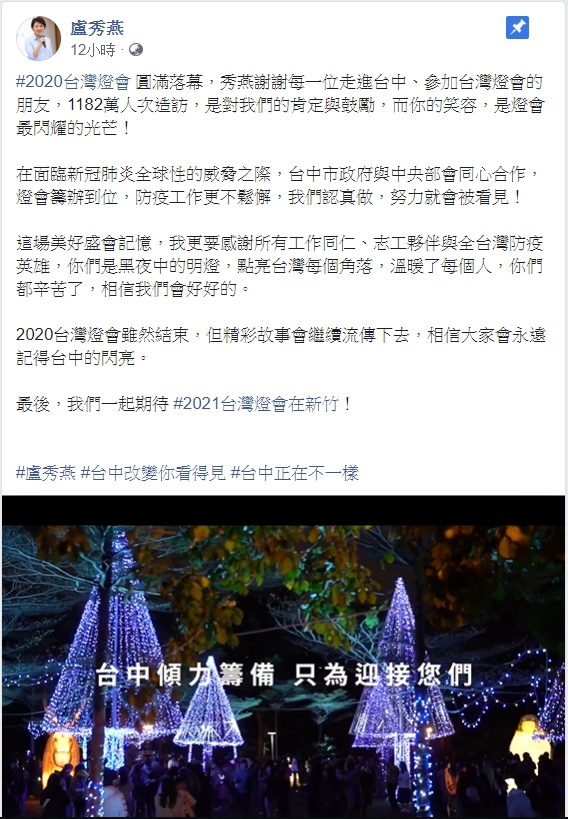 2020台灣燈會昨(23)晚畫下完美句點,台中市長盧秀燕在臉書分享影片,帶大家回顧燈會的精采點滴、工作夥伴們的努力及遊客的笑容。盧市長表示,感謝每一位走進台中、參加台灣燈會的朋友,1182萬人次造訪,是對我們的肯定與鼓勵,而「你的笑容,是燈會最閃耀的光芒!」