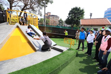 其中「共融公園」首要讓步道平順便於行走,輪椅及嬰兒車皆可進入;其次是兒童遊戲場的改造,以親子及身障者共同融合使用為目標,設置符合法規的無障礙坡道,將步道鋪面材質、寬度統一,打造無障礙環境,並推動高齡體健設施。