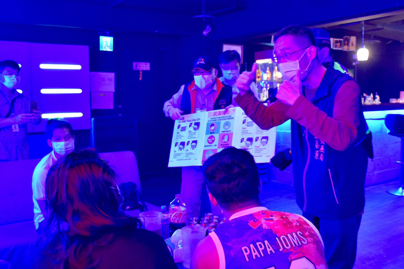 經發局表示,近期疫情造成東協廣場消費人潮下降,但為讓防疫滴水不露,昨日以印有中越、中印雙語版本的手持牌,進入KTV每間包廂宣導正確戴口罩資訊,並要求業者購買「額溫槍」進行量測作業。
