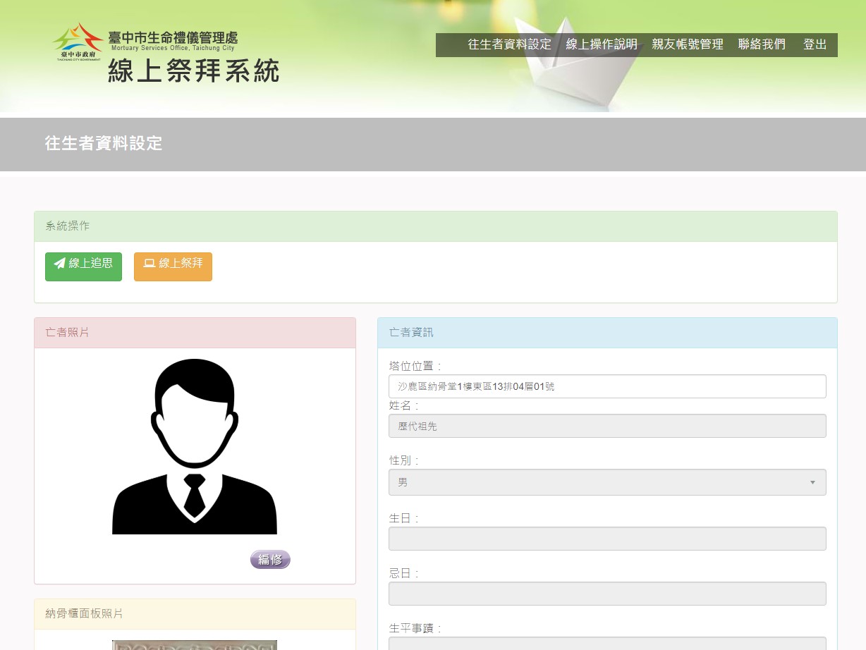 民政局長吳世瑋說明,線上祭拜系統( https://mortuary.taichung.gov.tw/Worship/Login.aspx )於105年起規劃建置「台中市殯葬資訊整合平台」,108年1月23日正式開放。包含「線上追思」及「線上祭拜」兩部分,凡往生先人有申請使用公立納骨堂塔者均可申請帳號,登入之後即可維護「追思園地」與「線上祭拜」,而且完全免費。