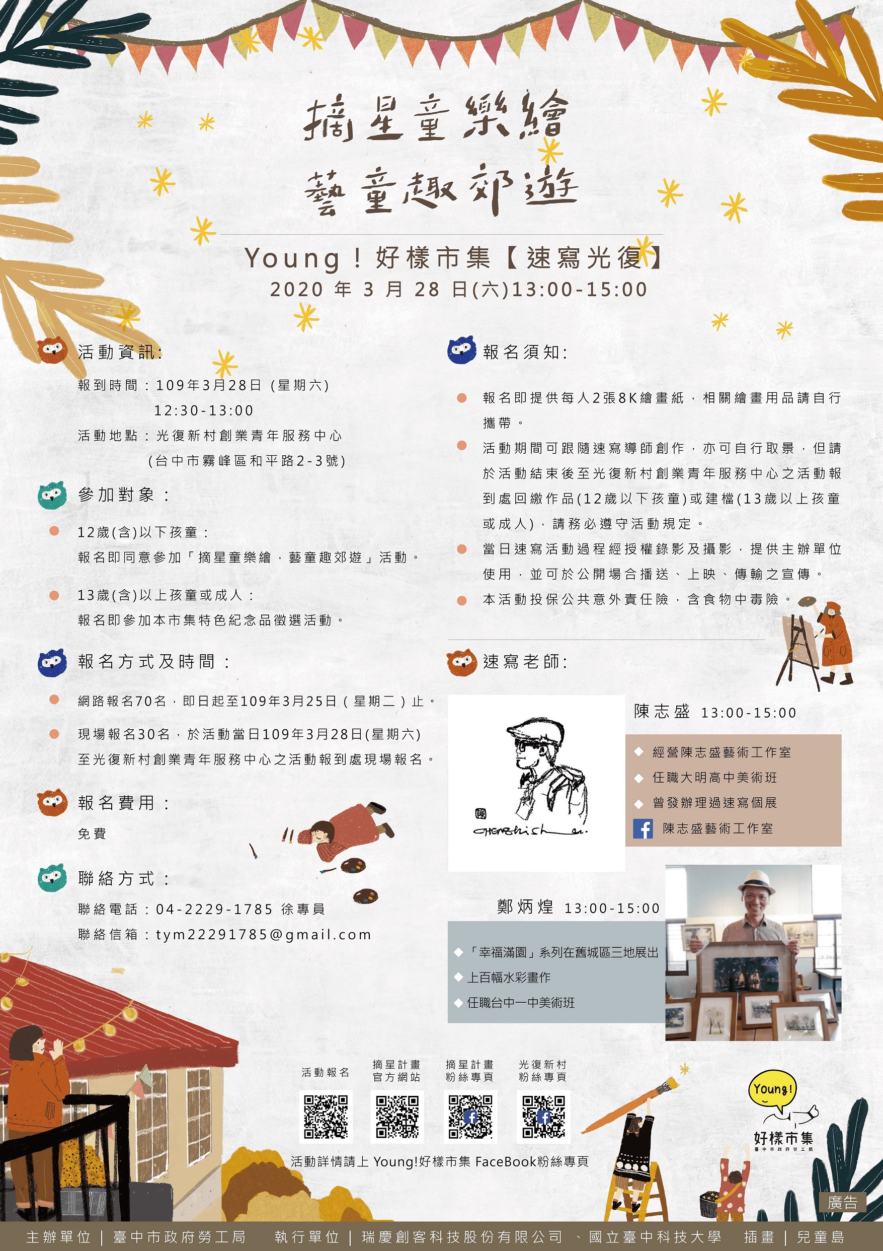 勞工局指出,「摘星童樂繪,藝童趣郊遊」系列活動自即日起至4月30日展開,邀請12歲(含)以下孩童於青創基地審計新村(淘氣文創、愚室實驗所)及光復新村(創業青年服務中心)免費領取限量寫生活動繪圖紙,發揮創意自由創作,郵寄作品至光復新村創業青年服務中心(霧峰區和平路2-3號),收件至4月6日中午12時止(以郵戳為憑),將選出100件優秀作品,除頒發獎狀獎品外,並將於4月11日至30日於光復新村展出。